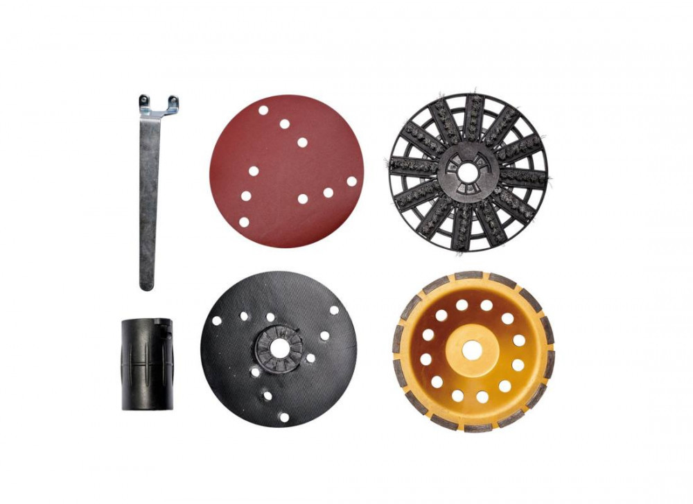 Levehető szegélyű kefegyűrű az élközeli munkák megkönnyítéséhez. Gyémánt csiszolófej. Mikro-tépőzáras csiszolótányér gipszkarton megmunkálásához. Acélkefe betonhoz és tapétamaradványok eltávolításához.