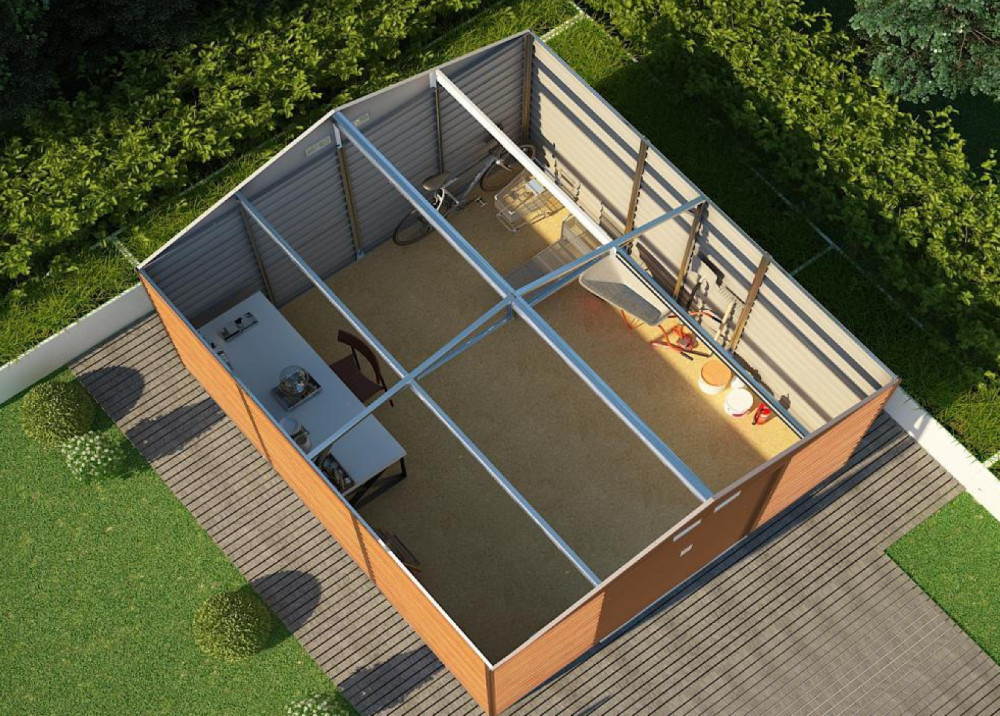 A tároló kiváló minőségű, 0,25 - 0,30 mm vastag profilozott acéllemezből készült, porszórt felülettel. Az acélszerkezet horganyzott, és szellőzőrácsokkal is rendelkezik, ami biztosítja a megfelelő szellőzést.