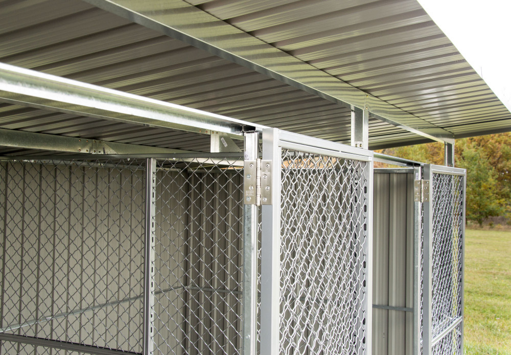 Kutyaketrec 2 kutyának 322 x 275 cm méretekkel tágas és ellenálló, három merev fallal, választó fallal és lejtő tetővel. A kutyaketrec 2 ajtóval rendelkezik az egyszerű hozzáférés érdekében, és reteszekkel a biztonságért.
