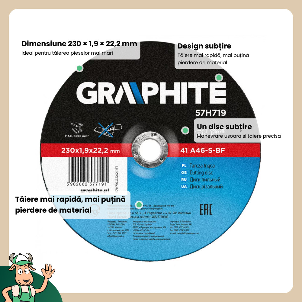 A Graphite fémvágó tárcsa előremutató kialakítása és vastagság csökkentése révén lehetővé teszi a vágáshoz szükséges idő jelentős lerövidítését. A termék megfelelése az EN 12413 szabványnak biztosítja a munkavégzés magas fokú biztonságát.
