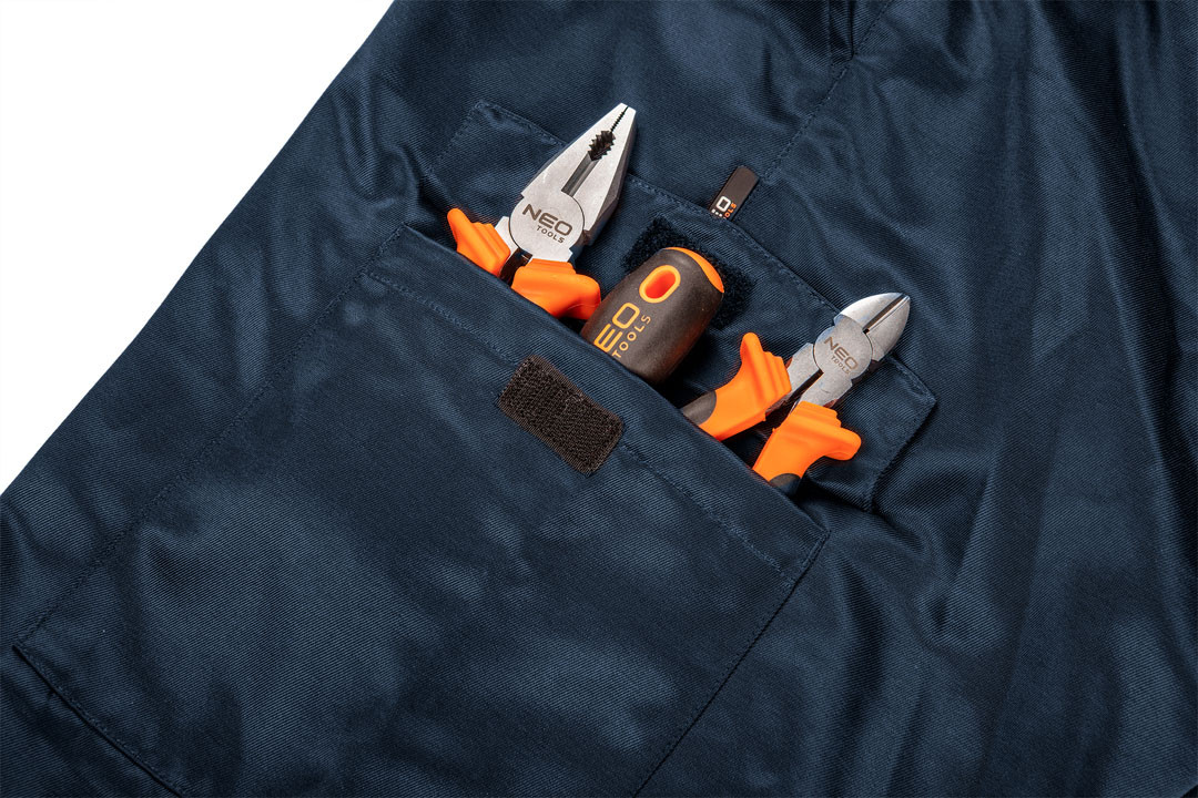 Neo láthatósági kantáros munkanadrág, sötétkék színű, intenzív láthatóságú részekkel, a viselője biztonságát növelő praktikus megoldás legyen szó nappali világítási körülményekről vagy sötétben, mesterséges világításnál, pl. a gépkocsik lámpáinak fényében. Kimagasló minőségű és szívós poliészter és pamut keverékű. A termék EN ISO 13688:2013 szabvány szerinti kivitelezése és az európai tanúsítványa minőségének garanciája. Az európai biztonsági standardoknak való megfelelőséget a CE tanúsítvány biztosítja.