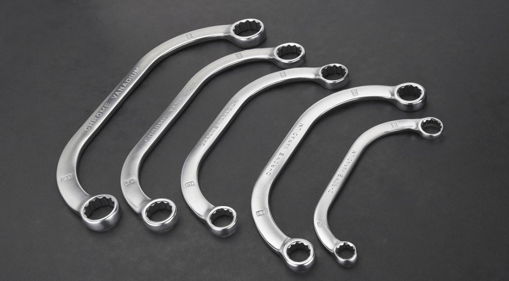 Neo hajlított csillagkulcs készlet 5 db kulccsal, 9 mm - 22 mm közötti méretekben. Különleges, „C" alakjának köszönhetően lehetővé teszi a más szerszámokkal nem hozzáférhető helyeken is a ki- és becsavarást. 9-12, 13-15, 14-17, 16-18, 19-22 mm. A kiváló minőségű króm-vanádium acél sokéves tartósságot biztosít a kulcsnak. A kulcsok praktikus, kulcsméreteket feltüntető tokba csomagoltak, a tok megkönnyíti rendben tartásukat