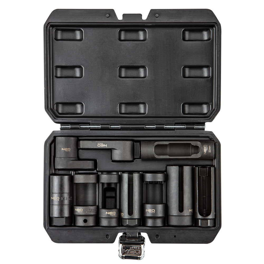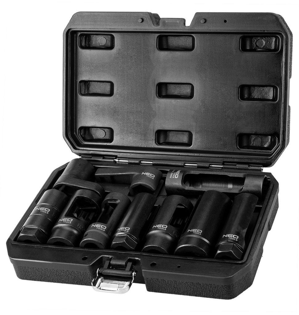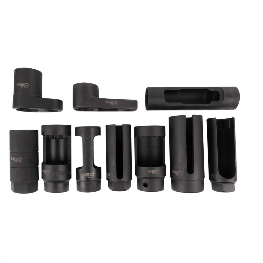 Neo injektor és lambdaszonda szerelő készlet, 10 db-os. Speciális dugókulcsok lambdaszondákhoz és injektorokhoz. Lehetővé teszi a különböző típusú lambdaszondák és injektorok szervizelését a népszerű márkák autóiban.