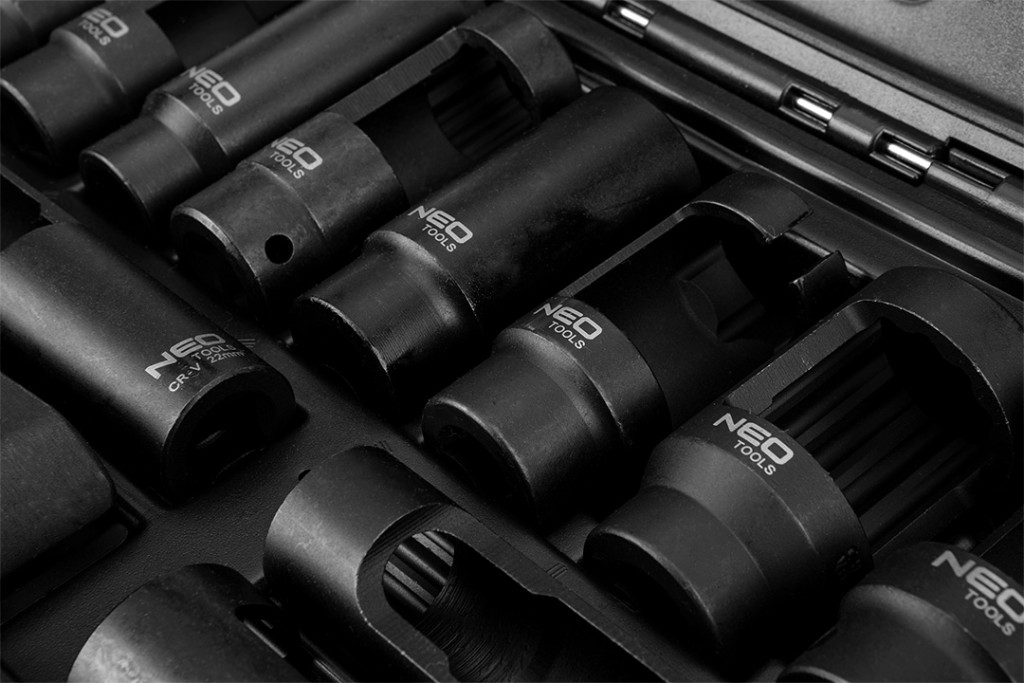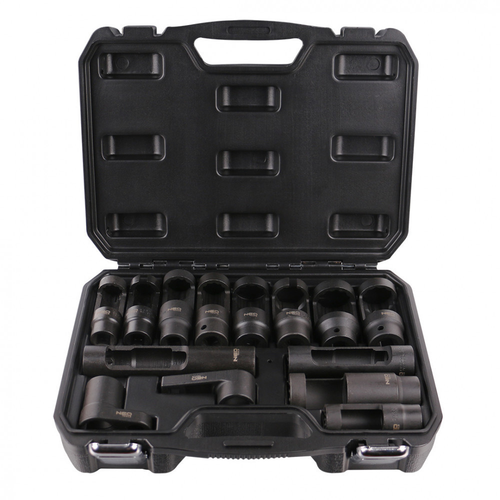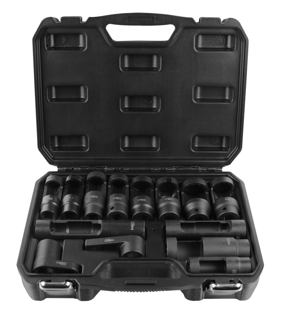 Neo injektor és lambdaszonda szerelő készlet, 14 db-os. Speciális dugókulcsok lambdaszondákhoz és injektorokhoz. Lehetővé teszi a különböző típusú lambdaszondák és injektorok szervizelését a népszerű márkák autóiban.
