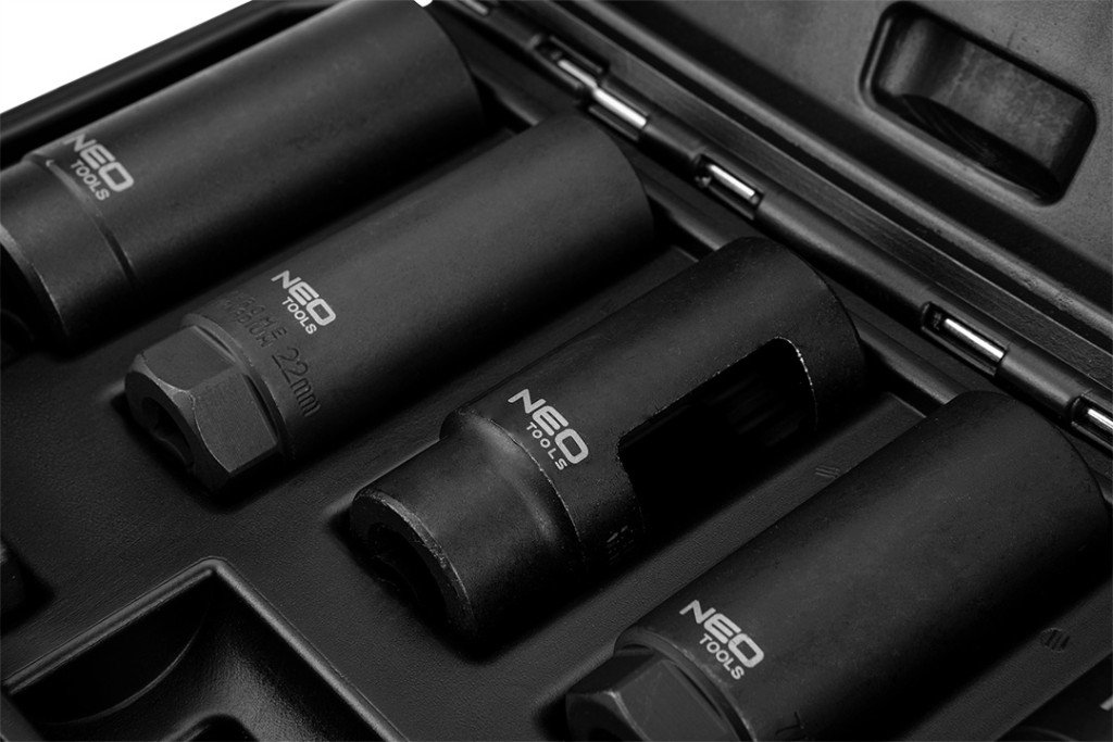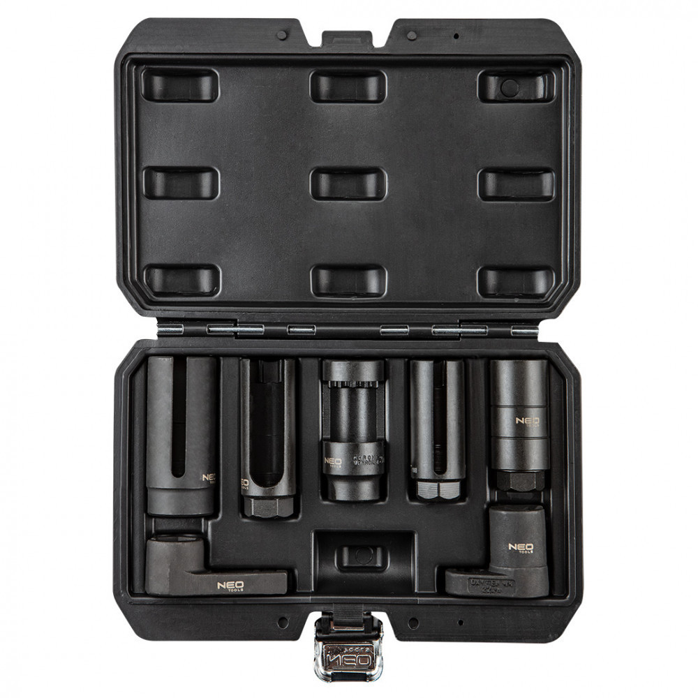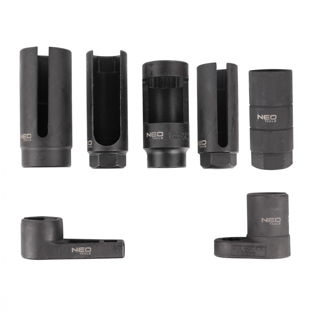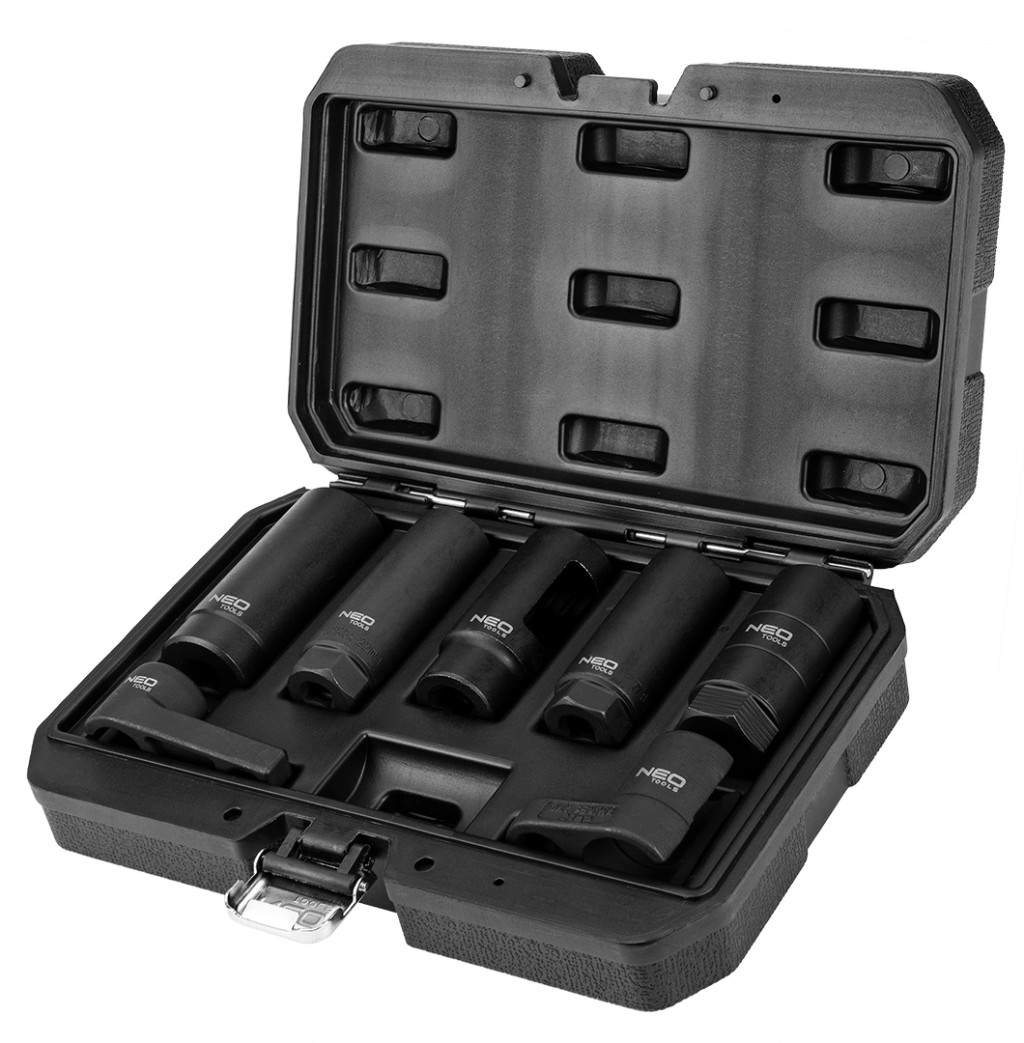 Neo injektor és lambdaszonda szerelő készlet, 7 db-os. Speciális dugókulcsok lambdaszondákhoz és injektorokhoz. Lehetővé teszi a különböző típusú lambdaszondák és injektorok szervizelését a népszerű márkák autóiban.