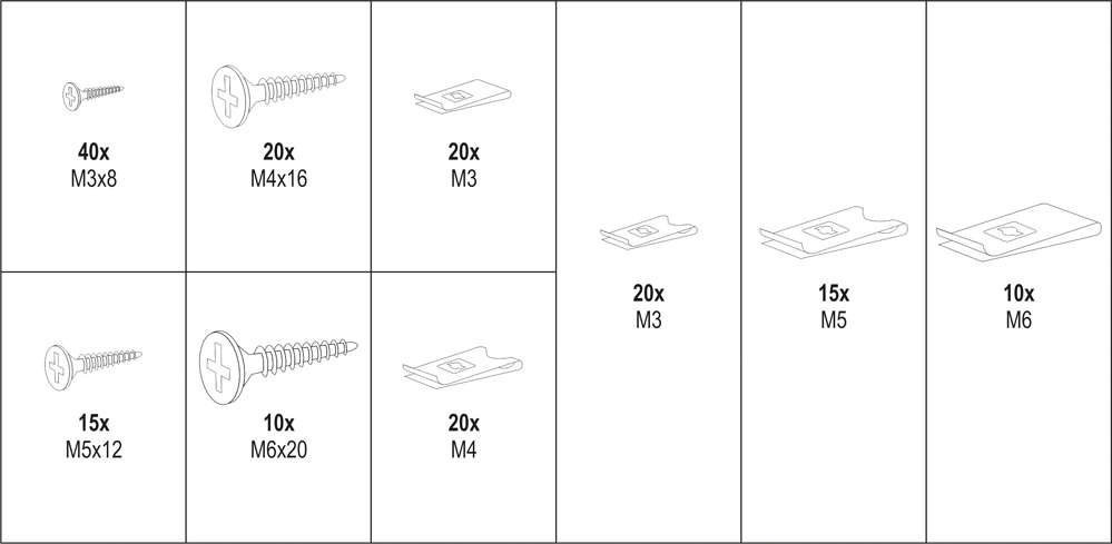 A készlet M3x8 mm-től M6x20 mm-ig terjedő méretű csavarokat és alátéteket tartalmaz.