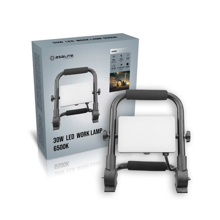 Asalite 30W hálózati LED munkalámpa, 2700 lm, 120° szög, IP65, 120 cm tápkábel, állítható dőlésszög, F energiaosztály, ~20000 üzemóra, 2 év garancia.