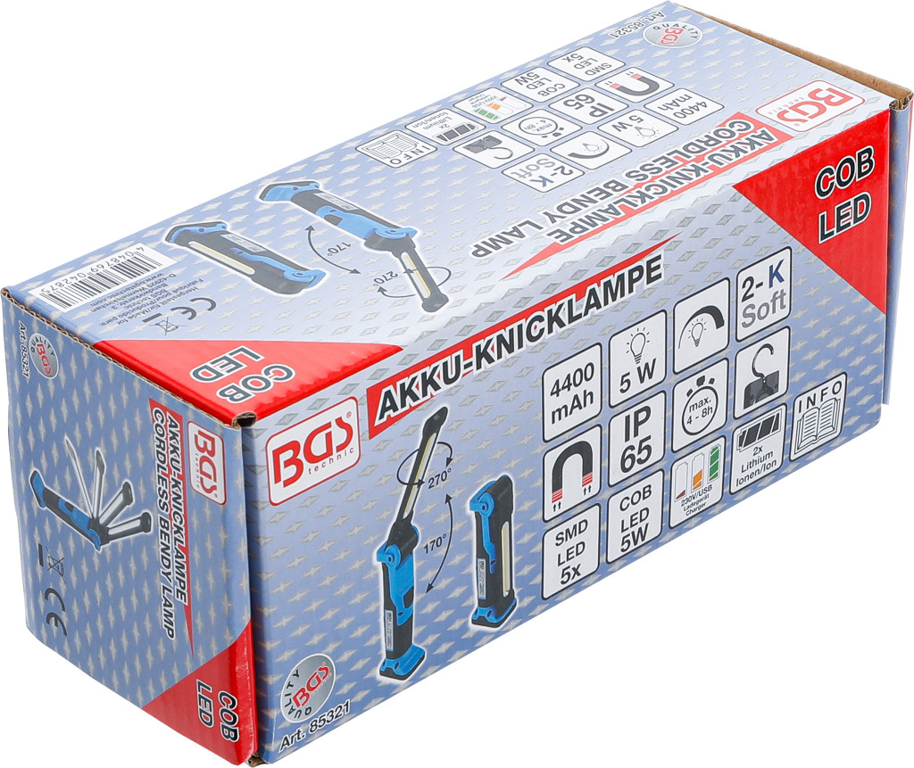 Az akkumulátoros, elhajlítható COB-LED lámpa 5 W COB LED-del és 5 db SMD LED-del, 500/300 lm fényerővel és 6500 K színhőmérséklettel. 50%-os fényerő-szabályozás, a lámpafej 170°-ban billenthető és 270°-ban elfordítható. Egy töltéssel 4–8 óra üzemidőt biztosít két 18650 Li‑ion (4400 mAh) akku; 2-színű töltöttségjelző, ütésálló kivitel, működési tartomány -20–60 °C. IP65 védettség, kampó és mágnes a talpon, használható bedugott töltőkészülékkel is. Tartozék: 230 V töltő és micro USB kábel. Méretek: 185 x 69 x 45 mm.