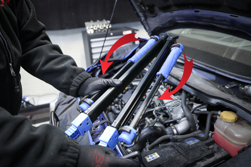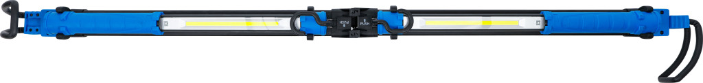 Akkus COB-LED motorháztető lámpa feszítőszerkezetes tartóval, 2 COB kézi lámpa, 2×4400 mAh Li-ion, töltés 4 h, 2×15 W, 750/1500 lm, üzemidő 2/4 h, Micro-USB, 122–196 cm rögzítés.