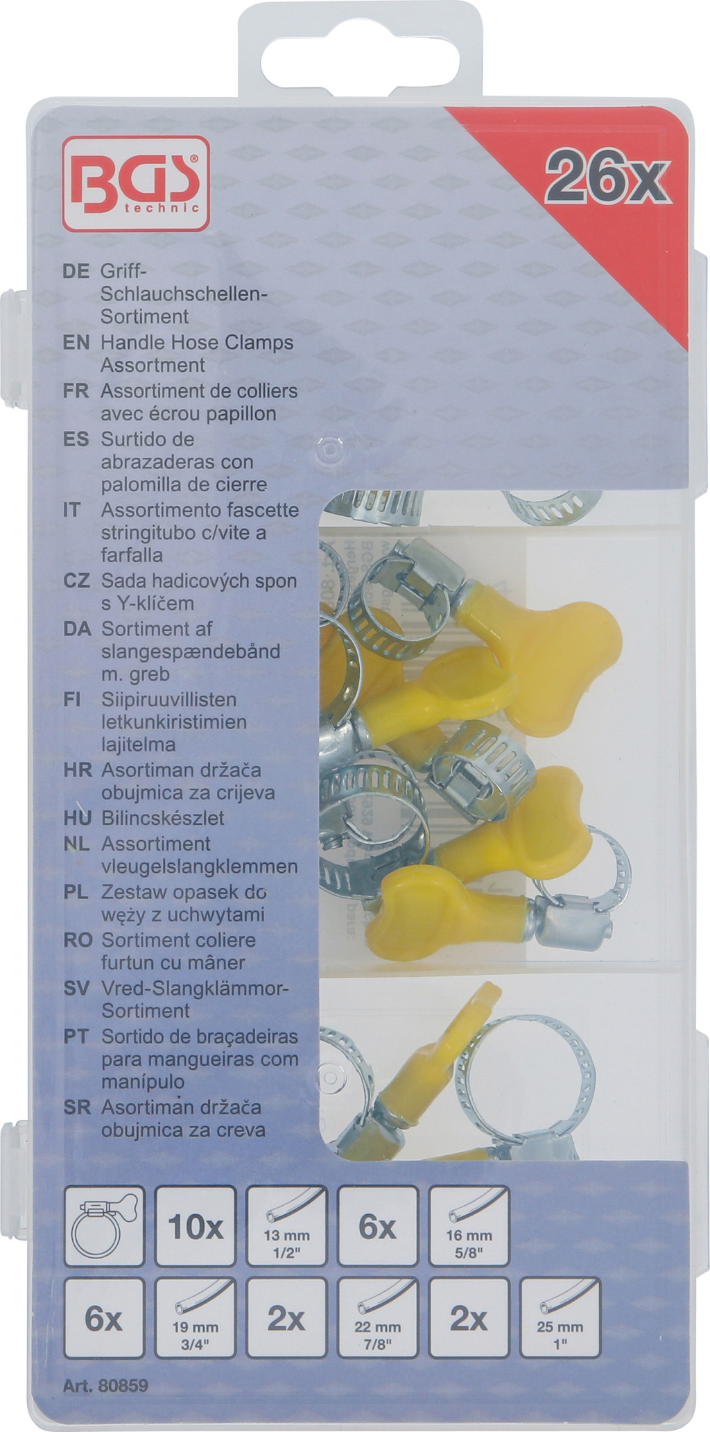 Bilincskészlet, 26 darabos kézzel húzható; szerszám nélküli szerelés. Falikárpithoz alkalmas csomagolás. Tartalom: 10×13 mm (1/2"), 6×16 mm (5/8"), 6×19 mm (3/4"), 2×22 mm (7/8"), 2×25 mm (1")