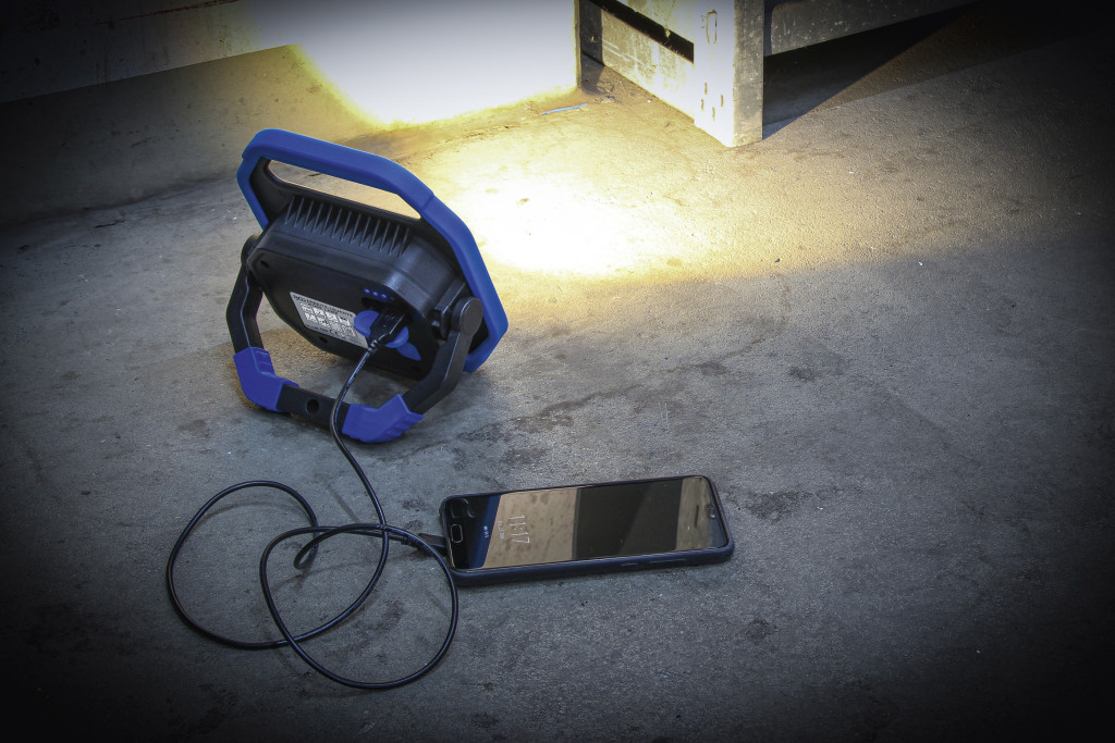 COB-LED Arbeits-Leuchte 10 W. 10 W COB LED, fényerő 600 lm / 1000 lm; két állítható, fokozatmentesen változtatható színhőmérséklet: meleg 2500–3000 K és hideg 6000–6500 K. Akkumulátor: 4400 mAh, 3,7 V, Li-ion (2 db); üzemidő 3 h, töltési idő 6 h. Alumínium ház gumibevonattal, intelligens kijelző (4 zöld LED) az akkuállapotra, beépített USB-A a mobil töltéséhez, töltőkészülék tartozék. IP54; méretek: 189,5 × 164,5 × 45,5 mm. Töltési hőmérséklet -5–45 °C; működési és tárolási tartomány -20–60 °C; elfordulási szög 180°.