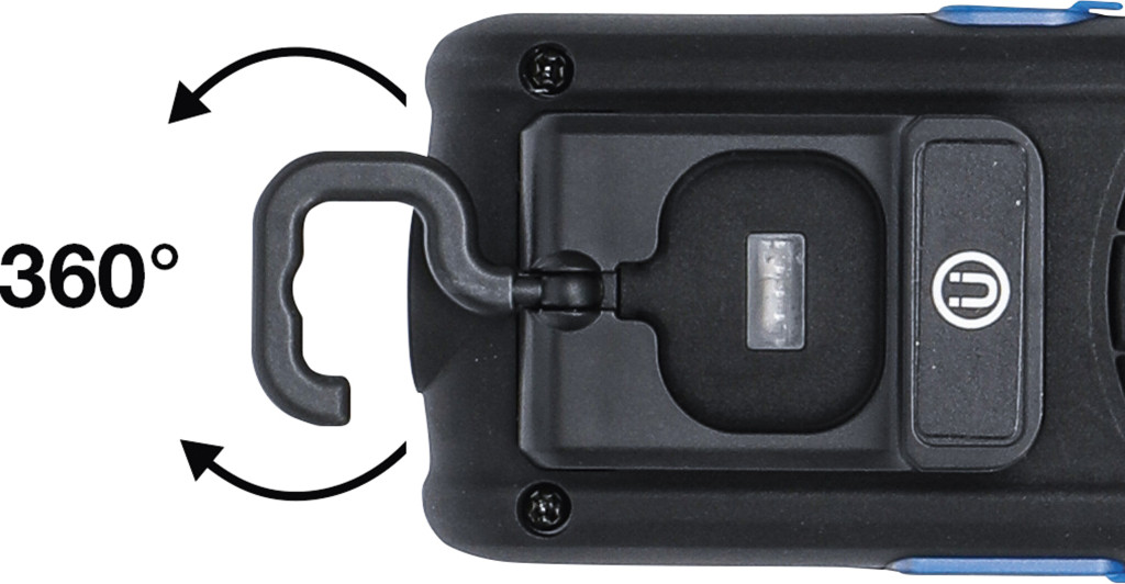 COB-LED összecsukható munkalámpa fej- és oldalfénnyel: 3 W fejfény (180–200 lm) és 5 W COB oldalfény (350–400 lm). Beépített 2000 mAh, 3,7 V Li-ion akkumulátor: fejfény 3–5 óra, oldalfény 2–2,5 óra; töltési idő kb. 3 óra. USB-C bemenet és USB-A kimenet (mobiltelefon töltésére). 180°-ban állítható láb, mágneses talp fémfelületekhez, 360°-ban forgatható kampó. Anyag: PC/ABS/TPR/alumínium. Méretek: 185 × 60 × 32 mm. Töltési hőmérséklet: -5–45 °C; működési tartomány: -20–60 °C.