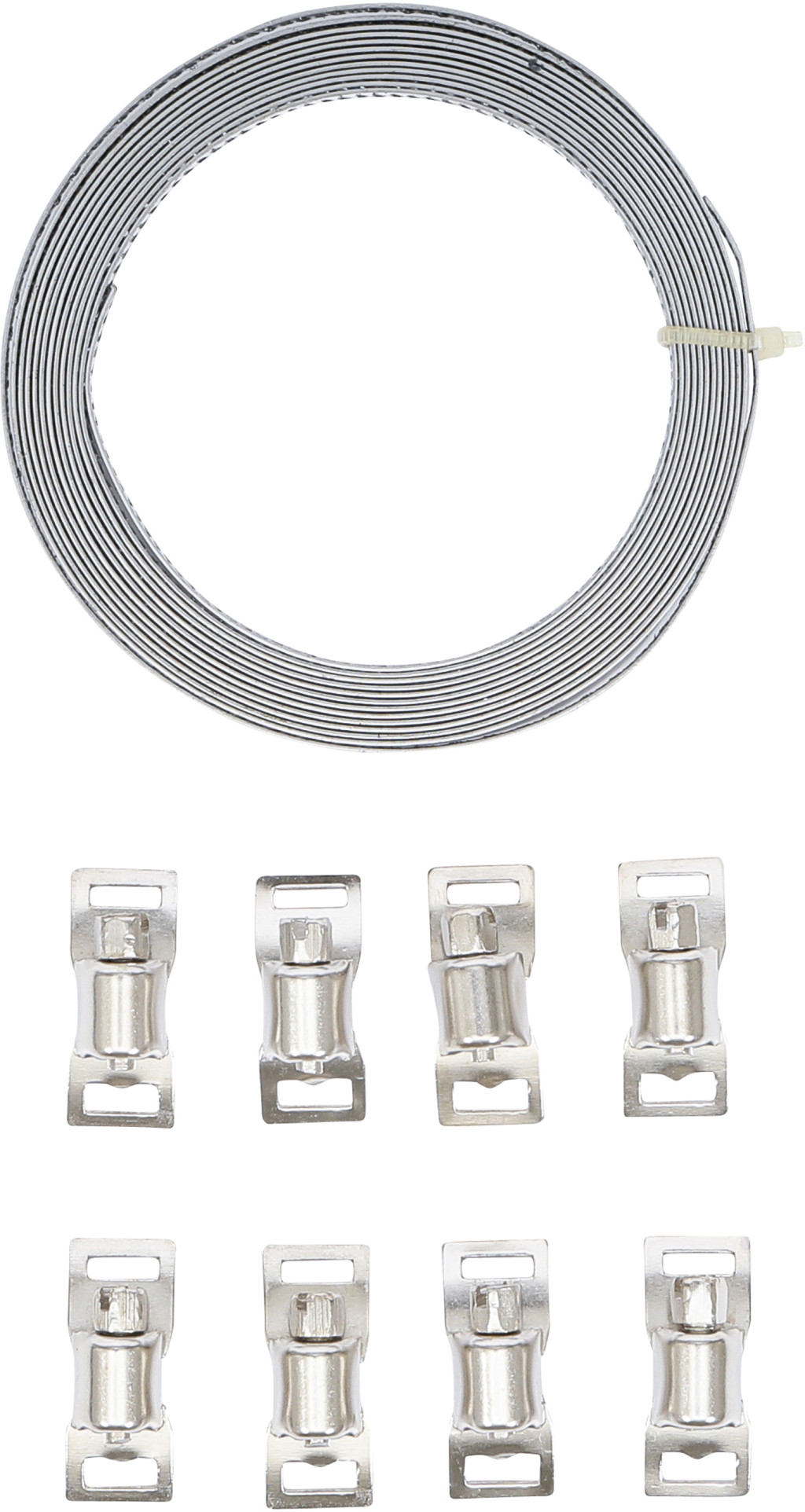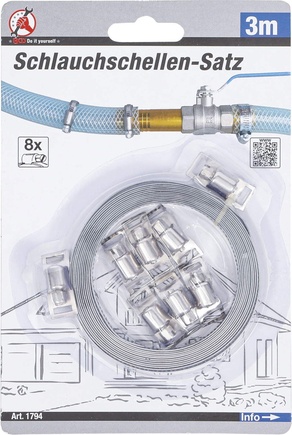 Csőbilincs készlet "Végtelen" 3 m: 3 m végtelenített, 8 mm széles szalag; bármilyen hosszúságú tömlőbilincekké alakítható; 8 kapcsos zár (hornyolt csavar); falikárpithoz alkalmas csomagolás.
