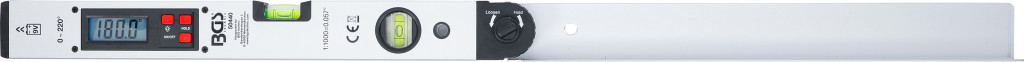 Digitális LCD szögmérő vízmértékkel, 450 mm hosszú. Szögek átvitelére és mérésére, mérési tartomány 0°–220°, beosztás 0,1° és pontosság +/-0,5°. Tartás funkció a mért érték rögzítéséhez, megvilágított LCD-kijelző, 2 libella (vízszintes és függőleges). Alumínium profilház, működtetése 9 V-os elemmel. Falra akasztható csomagolás.