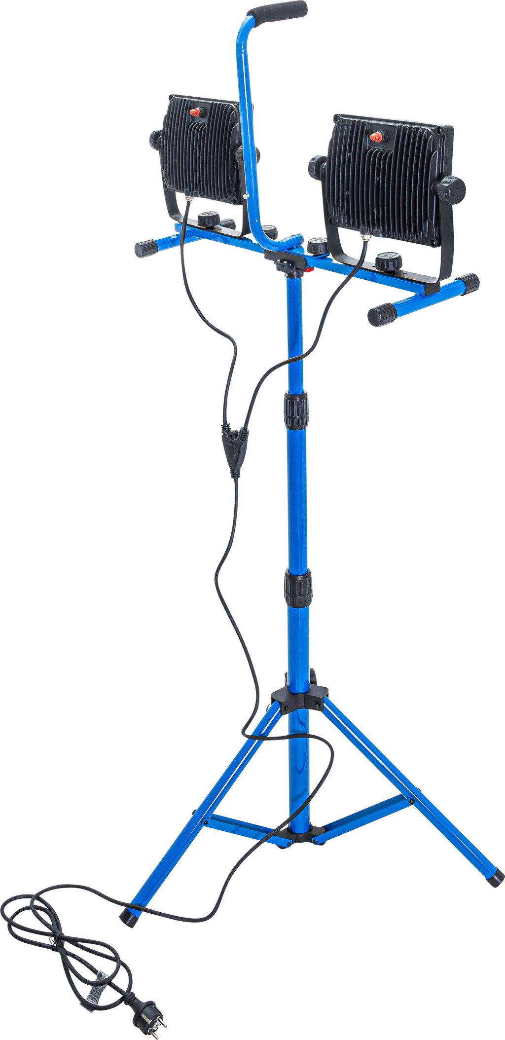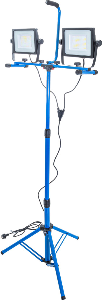 Duo-SMD-LED munkalámpa állvánnyal 2 x 70 W — két külön elforgatható munkalámpa, mindegyik 120 SMD-LED-del, teljesítmény 2×70 W, fényerő max. 2×7000 lm, színhőmérséklet 6000–6500 K, élettartam 50 000 óra. Tartós alumínium ház, teleszkópos acélcső állvány (magasság 1850 mm), lámpatartó hordozófogantyúval, vízálló be/kikapcsoló, IP65, hálózati 220–240 V, működési hőmérséklet −30…+50 °C. Beltéren és kültéren használható; a két reflektor egyetlen konnektorról üzemeltethető.