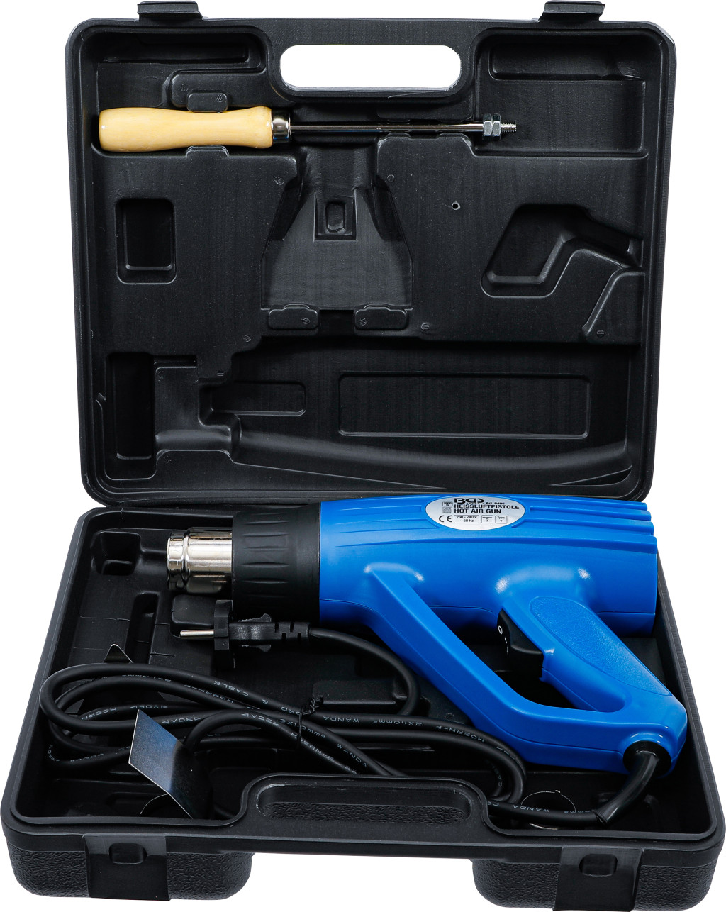 Forrólevegő-ventilátor 2000 W, 230 V, két hőmérsékleti fokozattal (400 °C / 600 °C). Használható hőzsugorcsövek zsugorítására és csomagolására, nem szigetelt kábelek és kábelsaruk forrasztására, forrasztott kötések meglazítására, műanyagok alakítására és hegesztésére, felületek szárítására, ragasztási folyamatok gyorsítására, jégolvasztásra, régi lakkok eltávolítására, felületek fertőtlenítésére, valamint motor- és sebességváltó-alkatrészek előmelegítésére összeszereléshez. Szállítási terjedelem: készülék, szűkítőfúvóka (Ø35 → Ø25 mm) és háromszög kaparó.