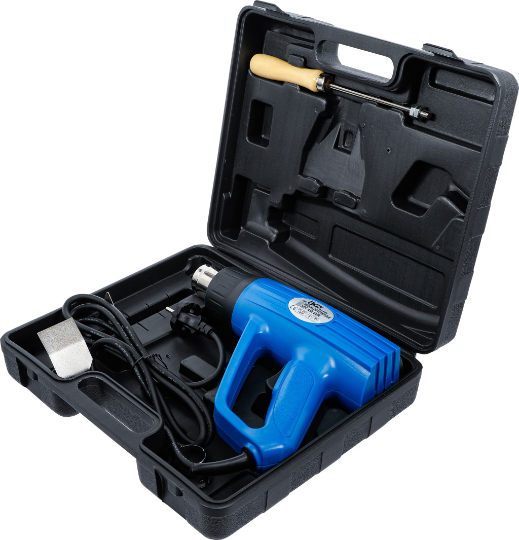 Forrólevegő-ventilátor, 2000 W, 230 V, 2 hőmérséklet: 400 °C / 600 °C. Alkalmas hőzsugorításhoz, forrasztáshoz, műanyag alakításhoz, felületek szárításához. Tartozék: szűkítőfúvóka, háromszög kaparó.