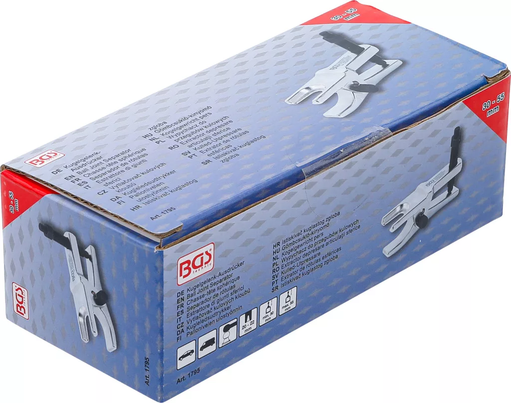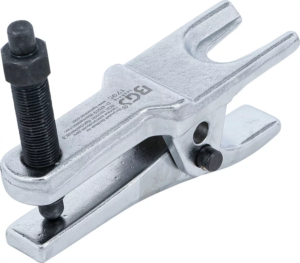 Kovácsolt gömbcsukló-kinyomó; kampós talp nyílása 20–22 mm; 2 pozícióban állítható befogási tartomány 30–55 mm; matt krómozott felület; kormányösszekötő rudak és stabilizátorok gömbcsuklócsapjainak kinyomásához.
