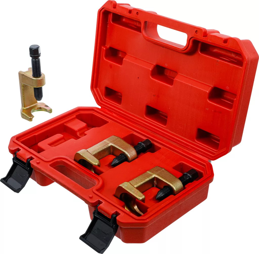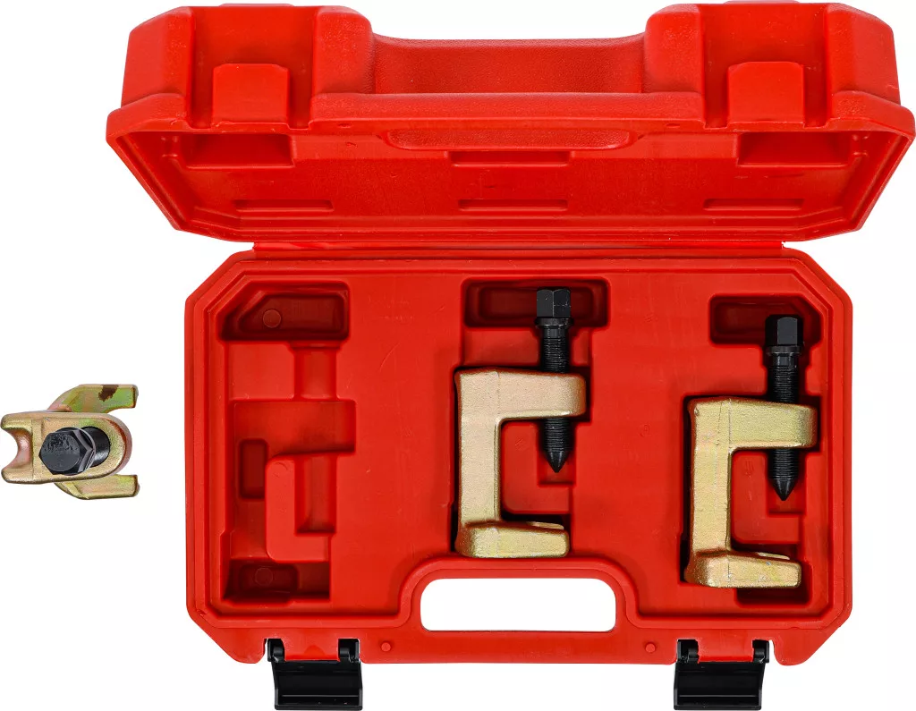 Gömbcsukló kinyomó készlet (23–28–34 mm), 3 darabos, szerszámacélból. Lehetővé teszi a kormányösszekötő rudak és tartócsuklók egyszerű, roncsolásmentes szétszerelését. Keskeny profilja alkalmas a legtöbb járműhöz; a három lehúzható lábméret lehetővé teszi a legtöbb személygépkocsin és könnyű haszongépjárművön való használatot. Szállítási terjedelem: lehúzó talpnyílás 23 mm, lehúzási szélesség 55 mm; lehúzó talpnyílás 28 mm, lehúzási szélesség 55 mm; lehúzó talpnyílás 34 mm, lehúzási szélesség 63 mm.