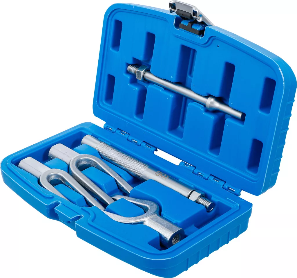 Gömbcsukló kiütő villa készlet, 5 db; cserélhető villafejek a kormányösszekötő fejek és kormányvezérlő karok gyors kioldásához; villa nyílás kb. 17,4–23,8–28,5 mm; kovácsolt szerszámacél; kézi és pneumatikus (10 mm) adapter.