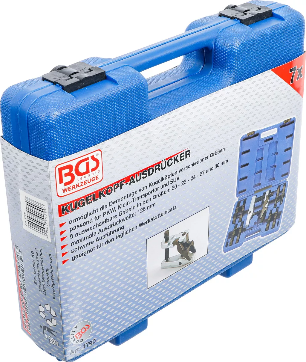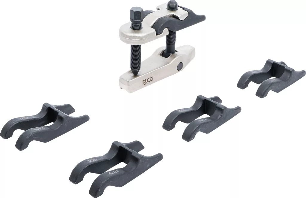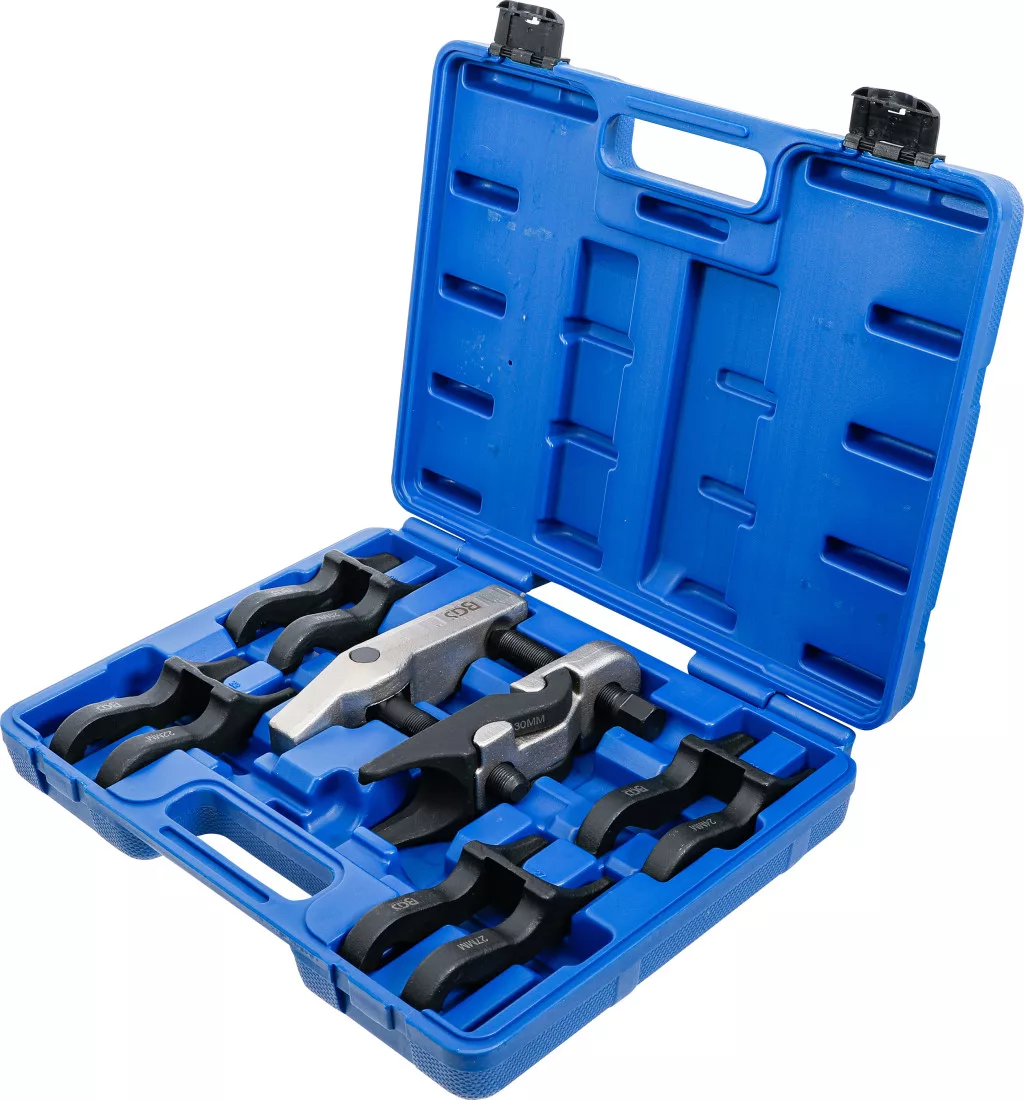 Gömbfejkészlet (7 darabos): lehetővé teszi különböző méretű gömbfejek kerékagyakból történő szétszerelését személygépjárművek, kistranszporterek és SUV-ok esetén. A készlet 5 cserélhető villát tartalmaz (20, 22, 24, 27 és 30 mm), a maximális kinyomási szélesség 125 mm. Nehéz kivitel.