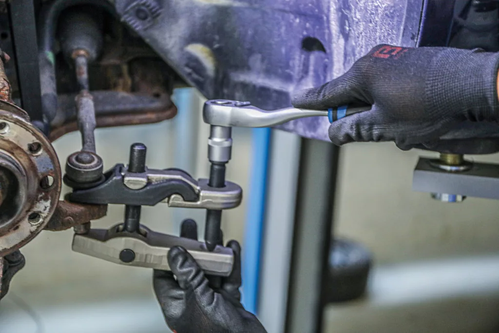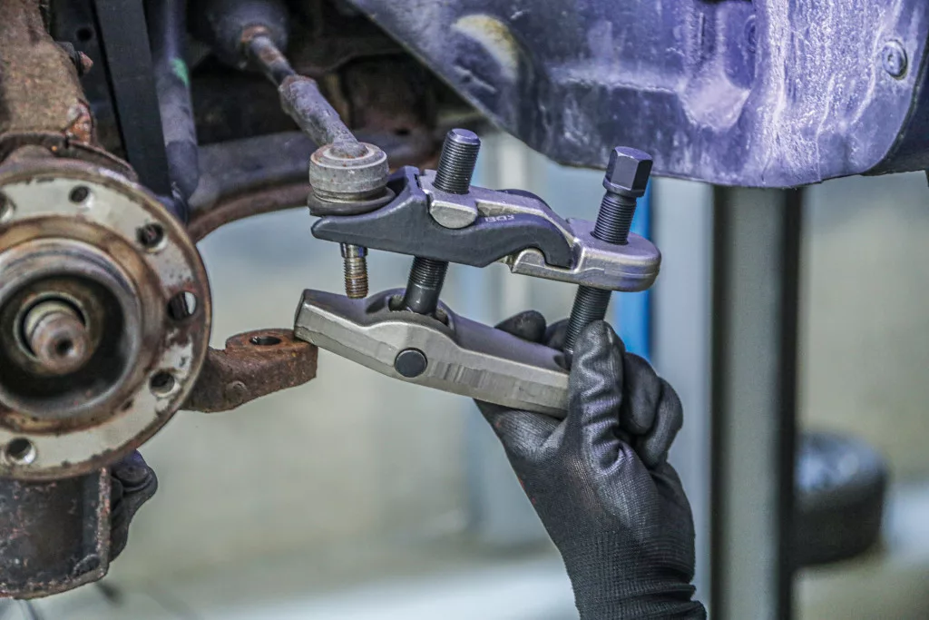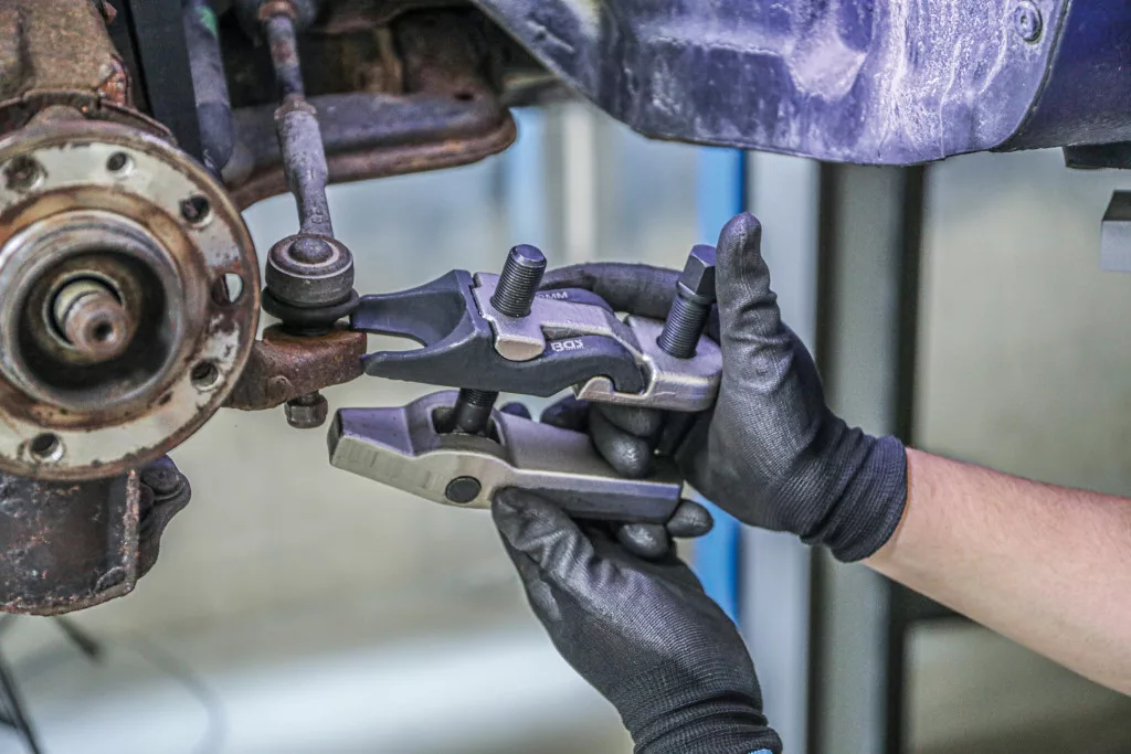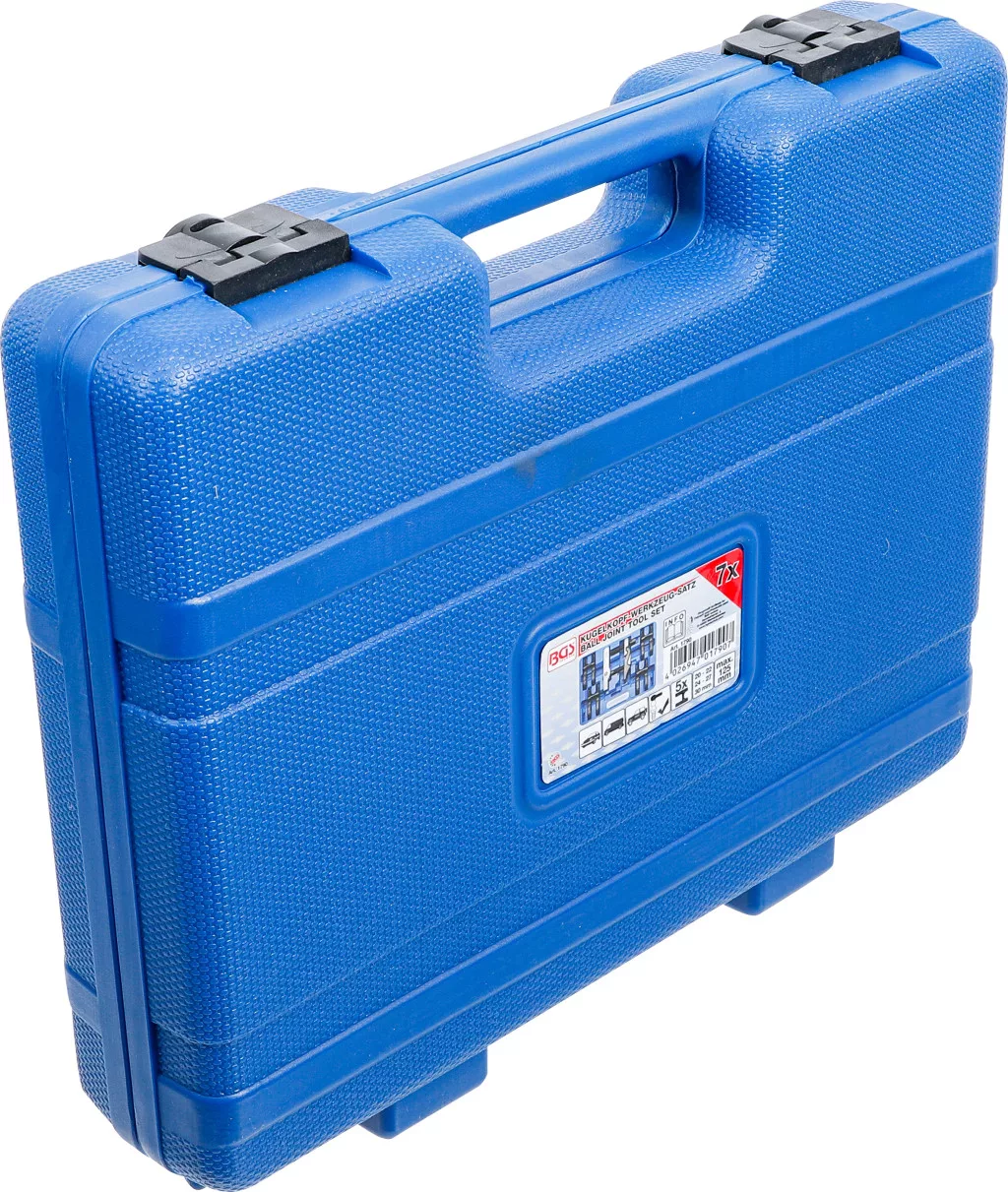 Gömbfejkészlet (7 darabos): lehetővé teszi különböző méretű gömbfejek kerékagyakból történő szétszerelését személygépjárművek, kistranszporterek és SUV-ok esetén. A készlet 5 cserélhető villát tartalmaz (20, 22, 24, 27 és 30 mm), a maximális kinyomási szélesség 125 mm. Nehéz kivitel.