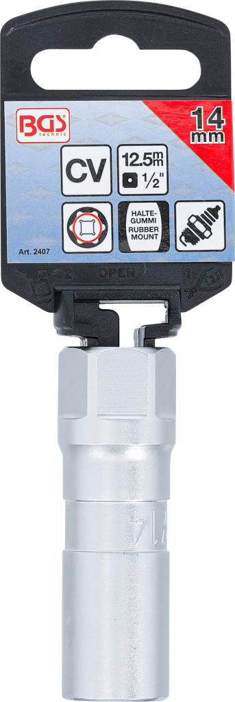Gyújtógyertya kulcs, hatszögletű 14 mm, belső négyszögletű meghajtónyílással 1/2" (12,5 mm). Króm-vanádium acélból, krómozott felülettel készült. Gumibetéttel biztosítja a gyújtógyertya stabil rögzítését a meglazításhoz és rögzítéshez. Csomagolása falikárpithoz alkalmas.