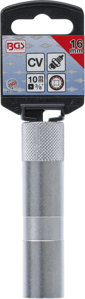Gyújtógyertya kulcs tartógumival, tizenkétszögletű meghajtott profillal. Meghajtó: belső négyszögletű kulcsnyílás 3/8" (10 mm). Kulcsméret: 16 mm. Hossz: 90 mm. Anyaga: króm‑vanádium acél; felület: matt krómozás. Csomagolása falra akasztható.