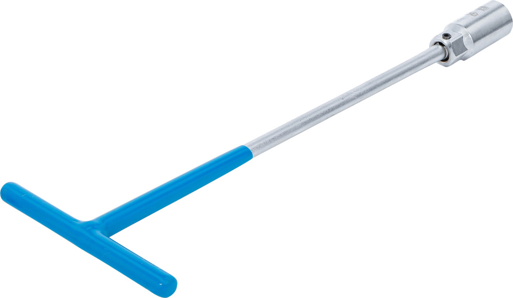 Gyújtógyertyakulcs T-fogantyúval, gömbcsuklós 20,8 mm. Hatszögletű meghajtó, műanyag bevonatú T-fogantyú, 375 mm hossz, falikárpitra akasztható csomagolás.