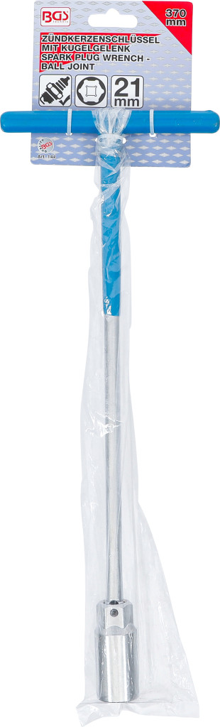 Gyújtógyertyakulcs T-fogantyúval, gömbcsuklóval, kulcsméret 20,8 mm. 375 mm hosszú kivitel, meghajtott profil: hatszögletű elem. A T-fogantyú műanyag bevonatú. Csomagolása falikárpithoz alkalmas, így üzletben akasztható bemutatásra.