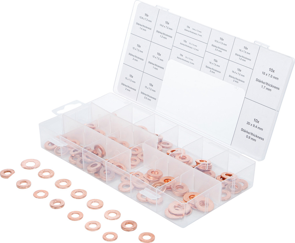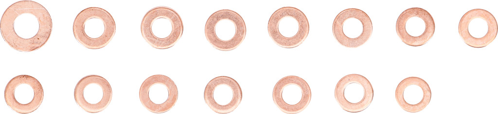 Injektor réztömítés készlet, 150 darab, T2 vörösrézből; pl. közös nyomócsöves dízel befecskendező (CDI) injektorainak tömítéséhez. Szállítási terjedelem: 10× Ø13,8/Ø7,3 mm vast.1,4 mm; 10× Ø14,6/Ø7,5 mm vast.1,3 mm; 10× Ø14,6/Ø7,5 mm vast.3,0 mm; 10× Ø15,0/Ø7,0 mm vast.2,0 mm; 10× Ø15,0/Ø7,5 mm vast.1,0 mm; 10× Ø15,0/Ø7,5 mm vast.1,5 mm; 10× Ø15,0/Ø7,5 mm vast.2,0 mm; 10× Ø15,0/Ø7,5 mm vast.2,5 mm; 10× Ø15,0/Ø7,5 mm vast.3,0 mm; 10× Ø15,5/Ø7,5 mm vast.2,0 mm; 10× Ø16,0/Ø7,5 mm vast.1,5 mm; 10× Ø16,0/Ø7,5 mm vast.1,7 mm; 10× Ø16,0/Ø7,5 mm vast.2,0 mm; 10× Ø16,4/Ø7,5 mm vast.2,0 mm; 10× Ø20,0/Ø9,4 mm vast.0,9 mm. Csomagolás: falikárpithoz alkalmas.