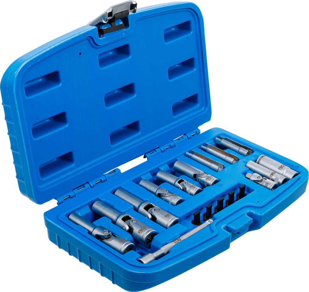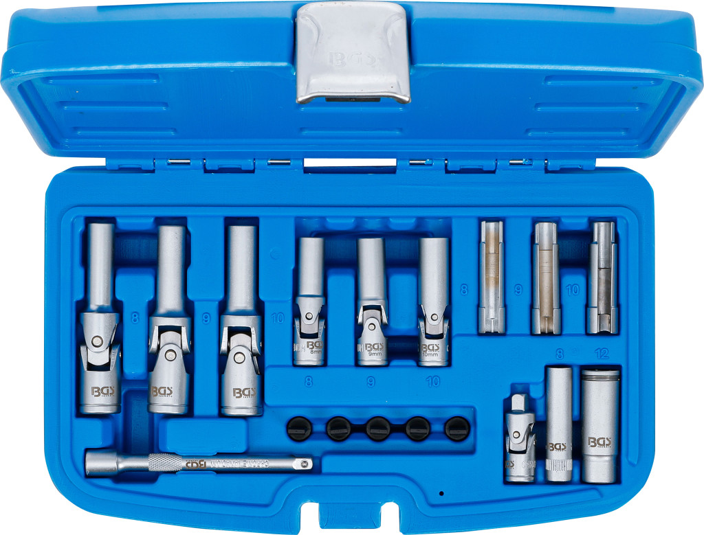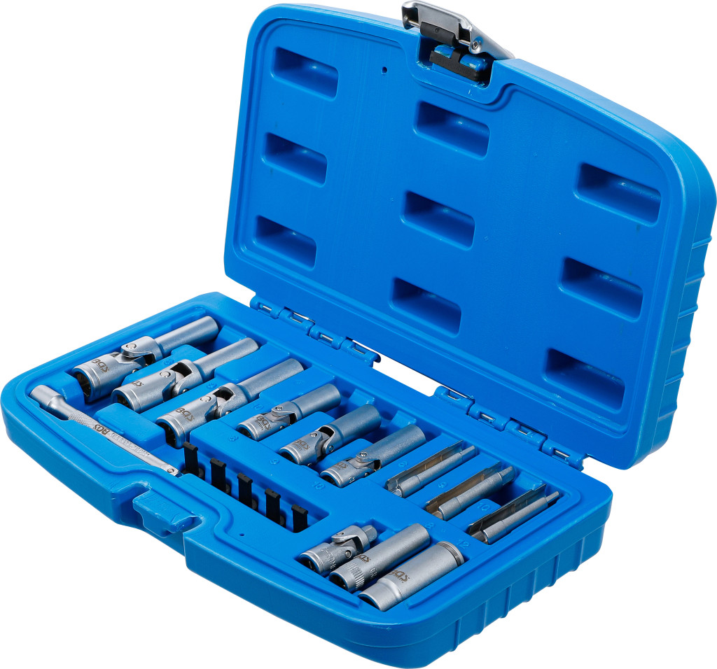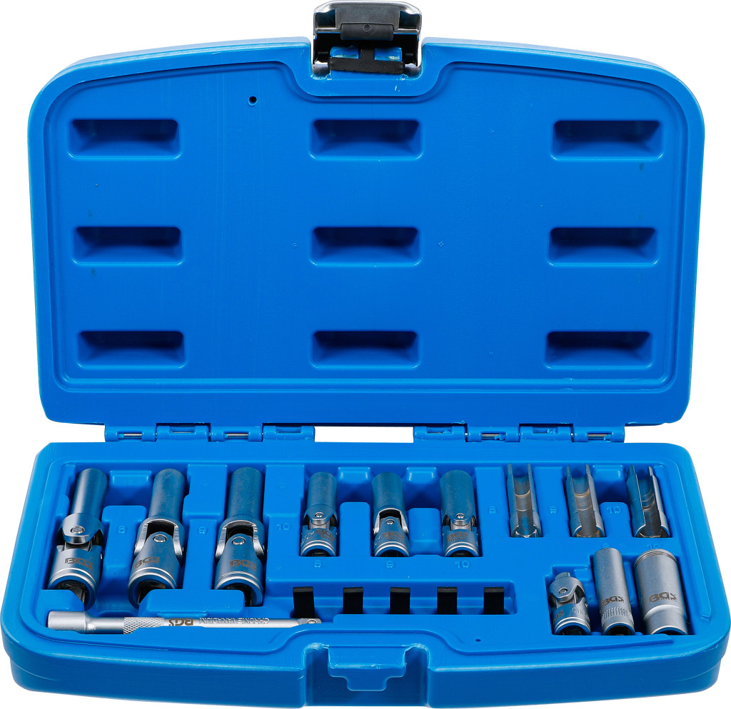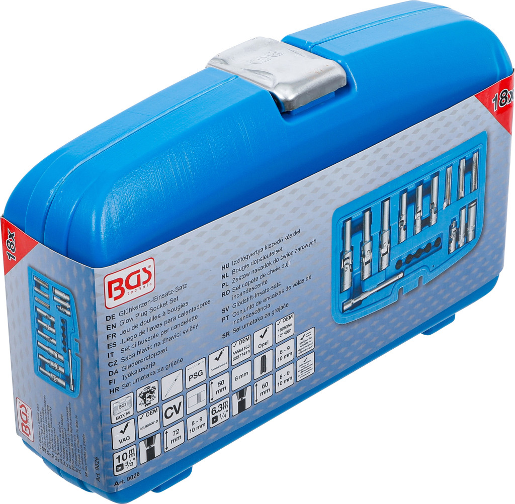 Izzítógyertya kiszedő készlet, 18 darabos, króm-vanádium acélból. Az általános kivitelű izzógyertyák és a nyomásérzékelővel ellátott PSG izzógyertyák szétszereléséhez és összeszereléséhez; kompatibilis GM 55564163 / 55577419, Opel 1826354 / 1214061, VAG 03L905061D OE-számokkal. A készlet 5 védősapkát tartalmaz a PSG-izzítógyertyacsatlakozó védelmére. Szállítási terjedelem: csuklós izzítógyertya-betétek 72 mm (belső 10 mm) 8–9–10 mm; csuklós betétek 60 mm (belső 6,3 mm) 8–9–10 mm; hornyolt izzítógyertya-betét 8–9–10 mm; dugókulcs bedugási mélység 50 mm 8 mm; PSG izzítógyertya kulcs tartógyűrűvel 12 mm; hosszabbító 100 mm külső/belső négyszögletű 6,3 mm; kardáncsukló külső/belső négyszögletű 6,3 mm.