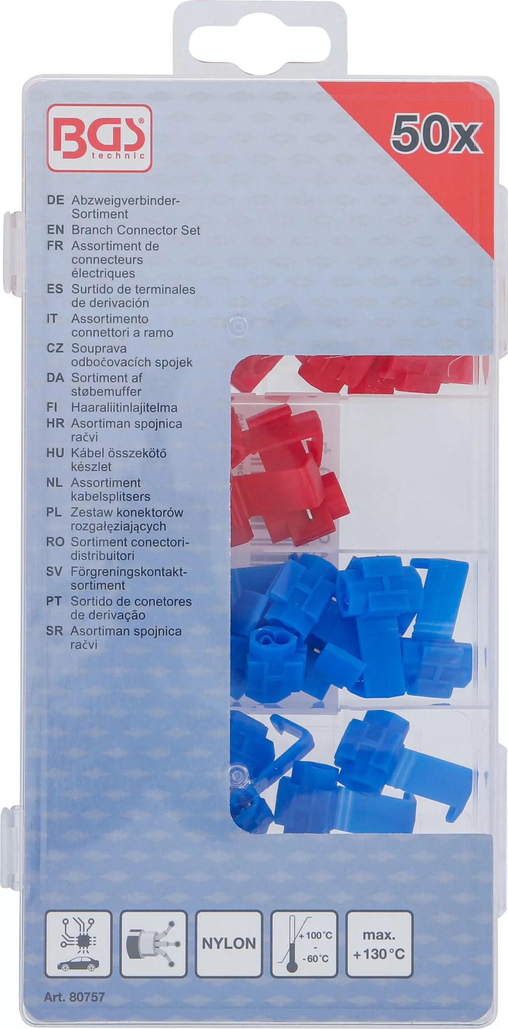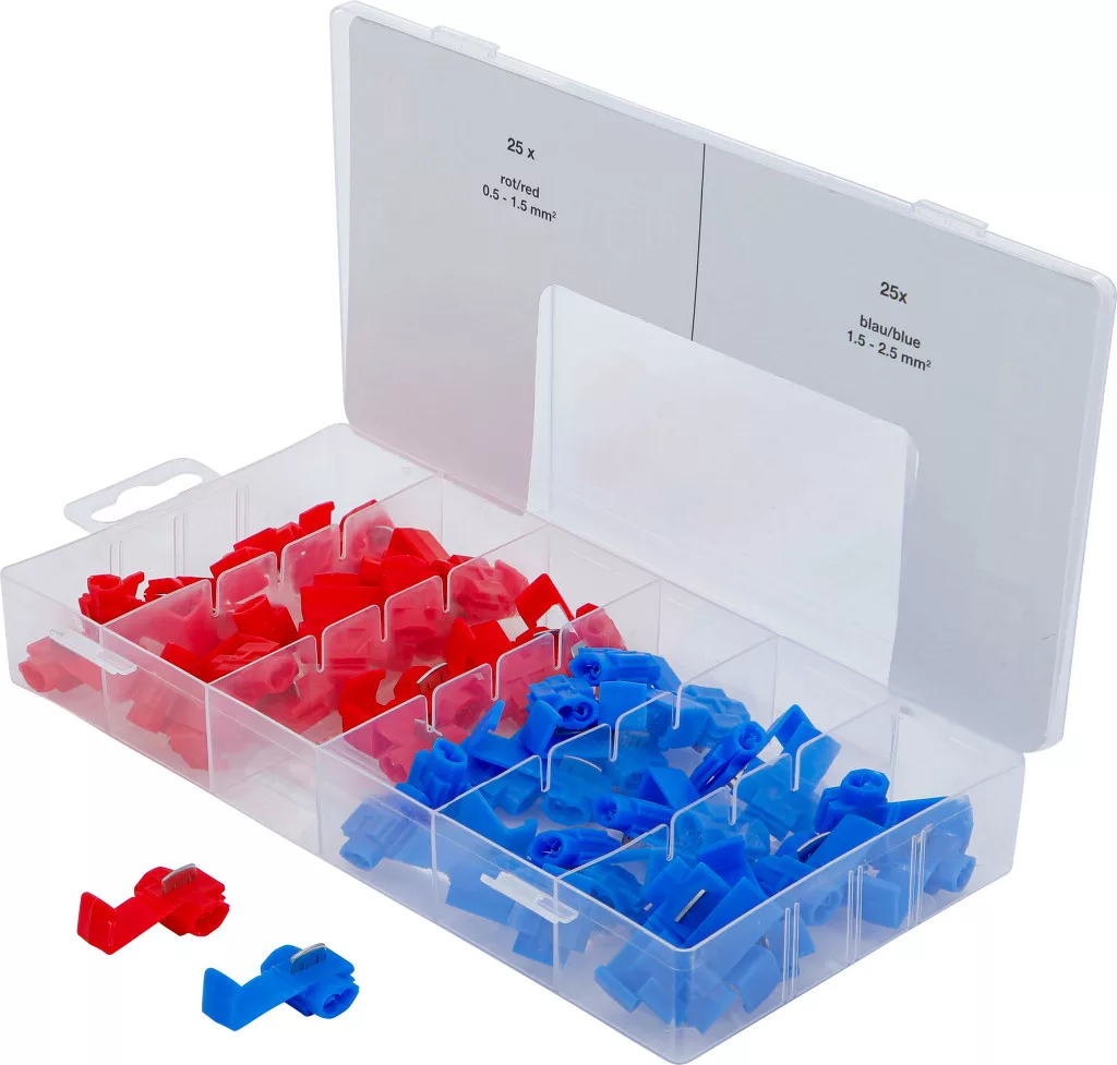 Kábel összekötő készlet, 50 darabos. A kapcsok nagyon jól vezető anyagból készülnek, a poliamid (nejlon) szigetelés a legjobb minőséget nyújtja. Hőmérsékleti tartomány: 60–110 °C, rövid ideig 130 °C. Szortimentdobozban, falikárpithoz alkalmas csomagolással.