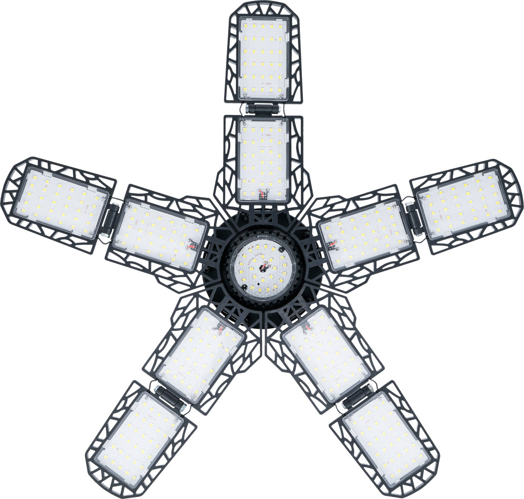 78 W LED-es garázsvilágítás, 8600 lm, 6000–6500 K, CRI>80, >50000 óra élettartam. 10 állítható szegmens, 4 összecsukható főreflektor (2-2 szegmens), +1 fix, akár 90°-ban dönthető, E26/E27, 85–265 V.
