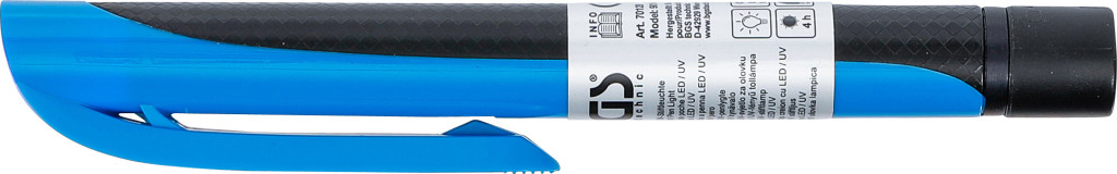 LED-es / UV-fényű tollámpa kompakt, hordozható világítás 3×AAA (1,5 V) táplálással. 5 W-os COB LED főfényt és 0,8 W-os UV spot LED-et kínál; az UV-fény alkalmas speciális ragasztók kikeményítésére és fluoreszkáló folyadékokkal végzett szivárgásvizsgálathoz. Mágneses talp, mellzseb-/övcsipesz be-/kikapcsolóval, könnyű egykezes kezelés, üzemidő max. 4 óra.