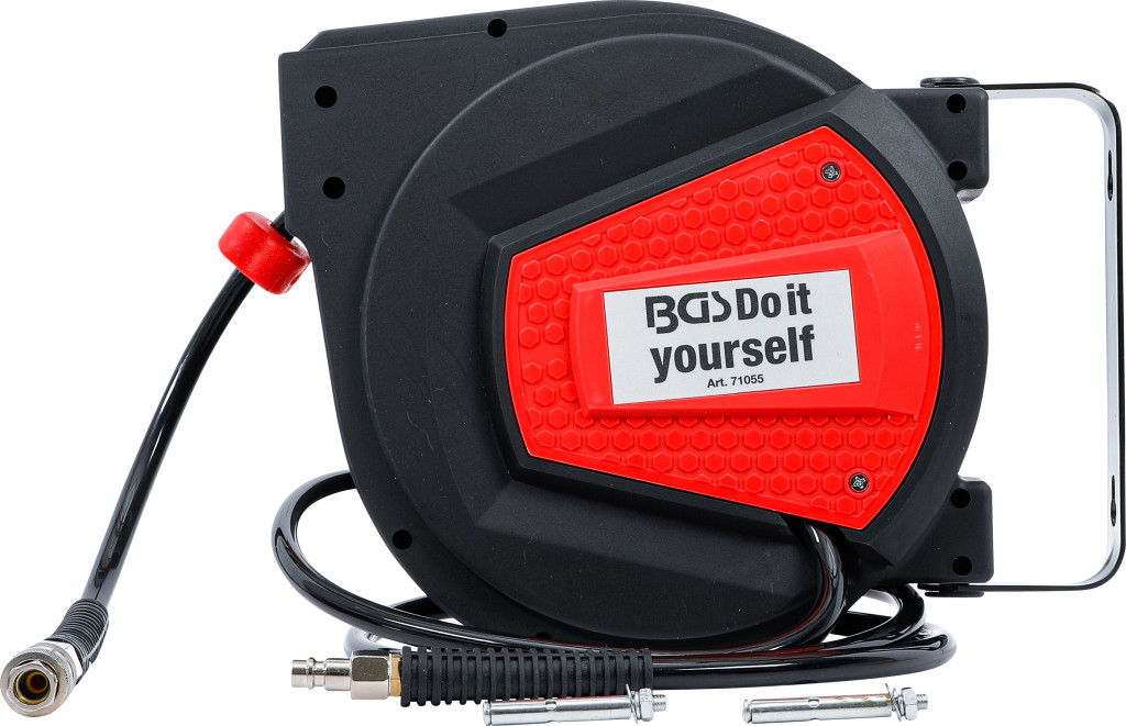 Levegőcső dobon Automatikus 10 m + 1,5 m — automata tömlőtekercs 10 m poliuretán tömlővel (belső Ø 8 mm, külső Ø 12 mm), üzemi nyomás 8 bar, sűrítettlevegő-csatlakozó 1/4". Műanyag ház védi a tömlőt, automata megállító funkció biztosítja a kívánt pozíciót, gyorscsatlakozó és dugó, egyszerű falra vagy mennyezetre szerelés, nagy elfordulási tartomány, fém tartókengyel és csavarok rögzítő dübelekkel. Tápkábel: 1,5 m.