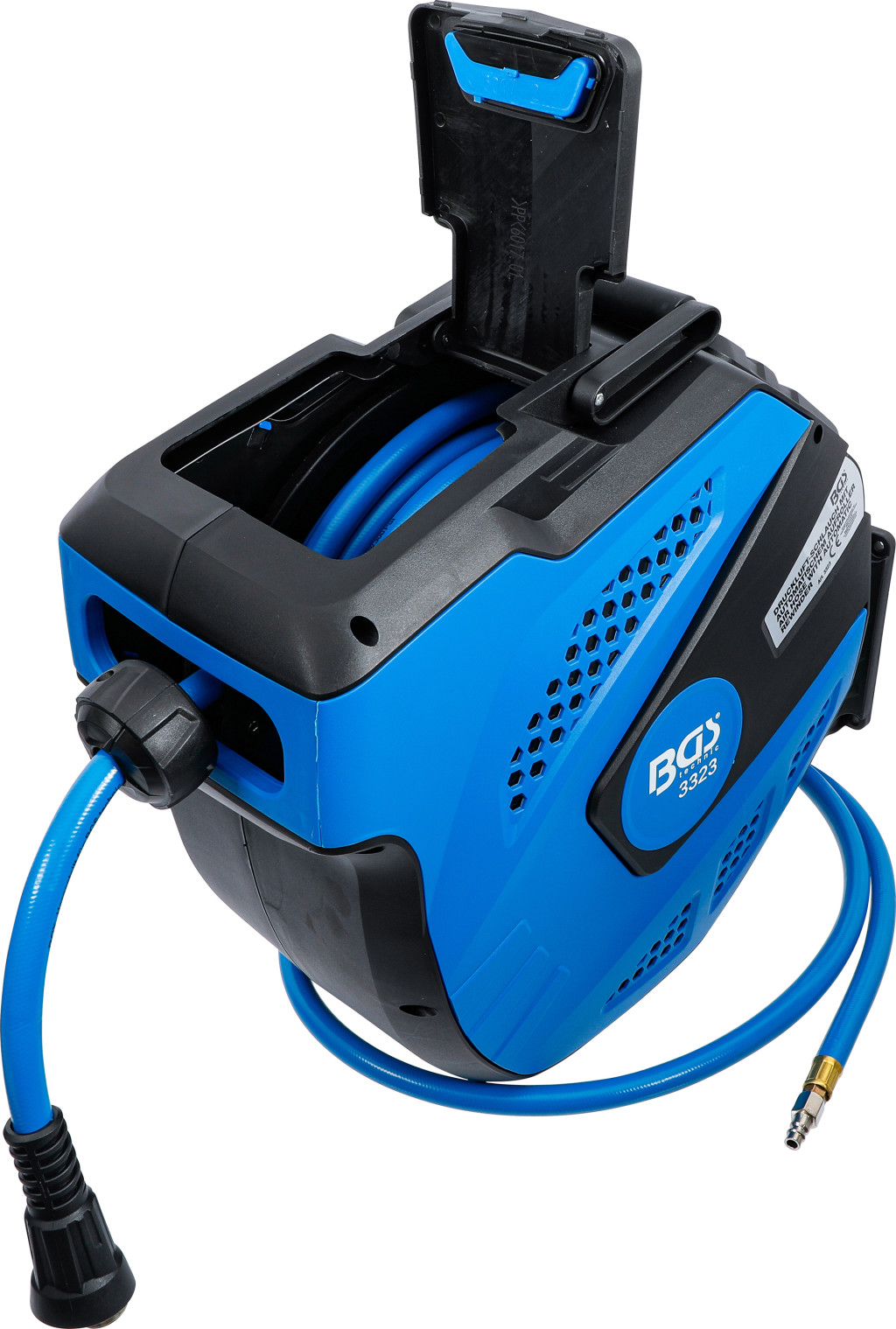 Levegőcső dobon Automatikus 12 m + 2 m: 14 m teljes tömlőhossz (12 m főtömlő + 2 m csatlakozó), belső átmérő 12 mm, külső átmérő 18 mm. Anyaga PVC szövet, üzemi nyomás 20 bar, sűrítettlevegő-csatlakozó 1/4". Dob automatikus visszatekercselés-gátlóval (rövid meghúzásra oldható), oldalra fordítható, falra szereléshez tartókonzollal együtt.