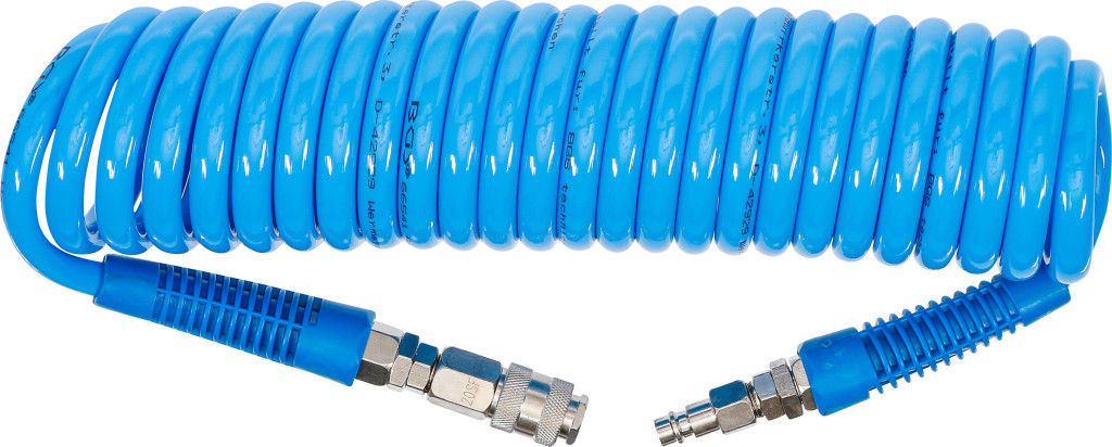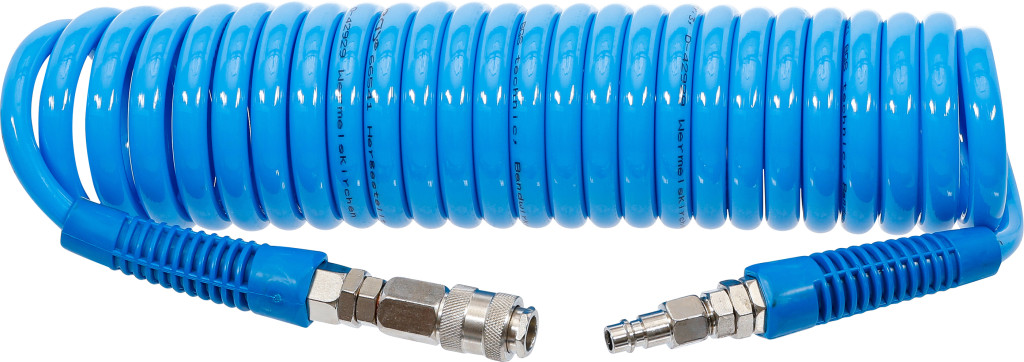 Levegős spirálcső 6 m, poliuretán (PU) anyagból, 8 mm belső és 12 mm külső átmérővel. Üzemi nyomás: 10 bar. Tömlőhossz: 0,9–6,0 m. 1/4" sűrítettlevegő gyorscsatlakozóval, megtörés elleni védelemmel a kuplungokon; elfordítható és kicserélhető kuplungadapter.