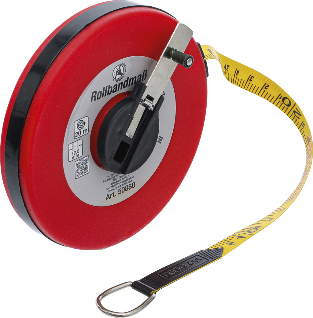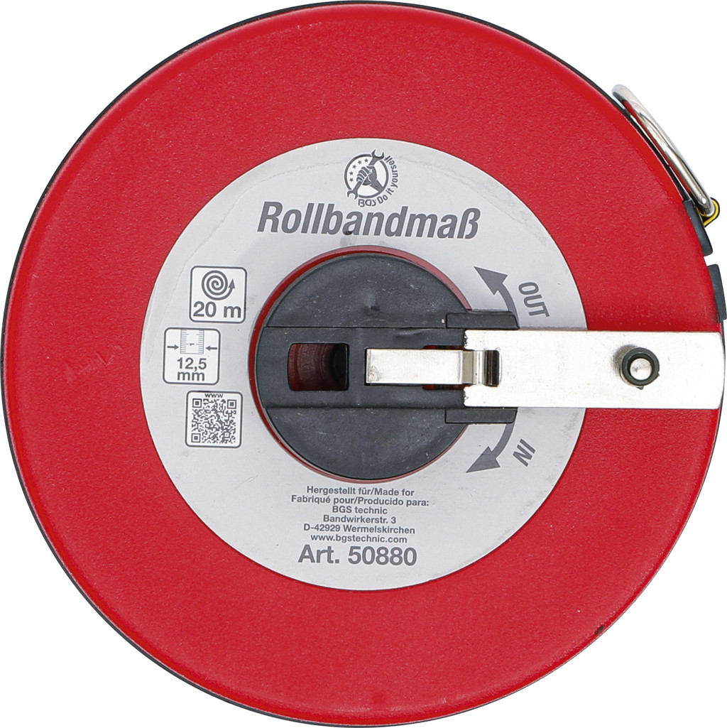 Mérőszalag 12,5 mm x 20 m — 20 m hosszú, 12,5 mm széles mérőszalag. Behajtható hajtókar, szennyeződés- és időjárásálló kivitel; kopásálló üvegszálas pánt; elöl és hátul metrikus skála. Falikárpithoz alkalmas csomagolásban szállítva.