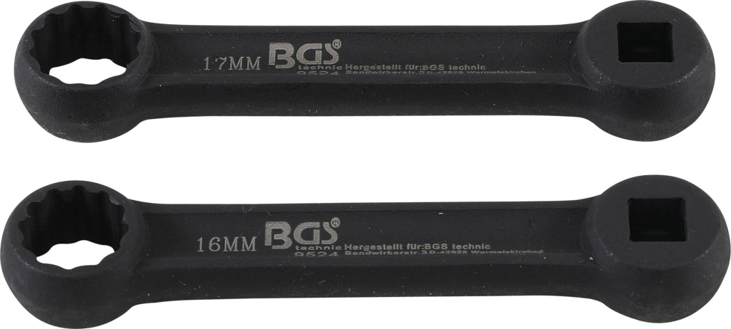 Motorcsapágy csillagkulcs-készlet, 2 darabos, Mercedes‑Benz. Két csillagkulcs: mindkettő belső négyszögletű behajtófej 10 mm (3/8"), 12 szögletű kihajtófejek 16 mm és 17 mm. Hossz: 100 mm. Falikárpithoz alkalmas csomagolás: Igen. Különösen a következő Mercedes‑Benz motorok csapágyaival kompatibilis: W220, W210, W203, W221, W211, W204, W124, W140, W170, W126, W201, W202.