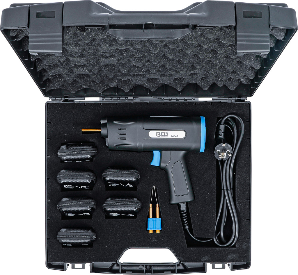 Műanyag javítókészlet repedések, törések, házrészek és belső/külső sarkok megerősítésére. Gyors, méretstabil javítás, festésre vagy simításra előkészítve. Nagy fényerejű LED, 3 fűtési mód, beépített mikroprocesszor és működést jelző LED-ek. Túlmelegedés elleni védelem és akusztikus figyelmeztetés. Könnyű pisztolytest; előre töréspontos fűtőkapcsok, fűtőrúdtartó és forrasztótartozék. Műszaki: 100–240 V, 75 W, ház: üvegszál-erősítésű poliamid. Tartalom: 1 hegesztőkészülék forrasztótartozékkal; 50× külső sarok 0,6 mm (BGS 73348); 50× belső sarok 0,8 mm (BGS 73349); 50× lapos 0,6 mm (BGS 73350); 50× lapos 0,8 mm (BGS 73351); 50× hullámalak 0,6 mm (BGS 73352); 50× hullámalak 0,8 mm (BGS 73353).