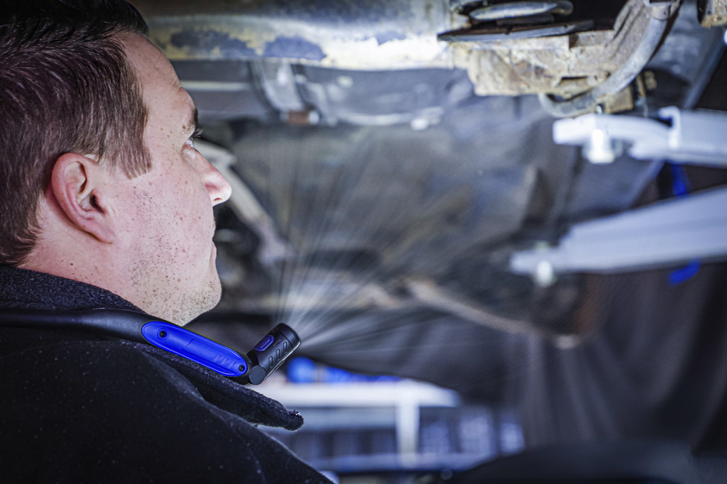 Univerzális, nyakban hordható akkus COB LED lámpa kétfokozatú világítással (50%: 160 lm, 100%: 320 lm) és 5500–6500 K színhőmérséklettel. Félig flexibilis kivitel a kényelmes tartásért; mindkét lámpafej függetlenül állítható 120°-ig. Beépített Li-ion akkumulátor 700 mAh (3,7 V), töltési idő 2,5 h, üzemidő 50%: 5 h / 100%: 2 h. USB-C töltés (5 V/1 A) és LED akkumulátorállapot-jelző a töltőaljzaton. IP54 védelem. Működési hőmérséklet: -10 °C–40 °C. Csomagolás falikárpithoz alkalmas.