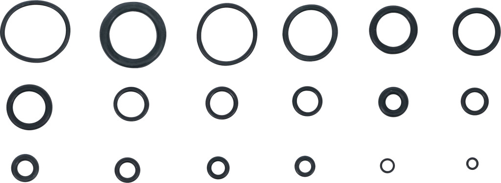 O-gyűrű készlet Ø 3 - 22 mm, 225 darabos. Anyaga: akrilkaucsuk (MBR). Szortimentdobozban, falra akasztható csomagolásban kerül szállításra. Szállítási terjedelem: 20× Ø3mm/1mm; 20× Ø4mm/1mm; 20× Ø4,5mm/2mm; 20× Ø5mm/2mm; 20× Ø6mm/2mm; 20× Ø6mm/5mm; 20× Ø6mm/3mm; 20× Ø7mm/2mm; 20× Ø8mm/2mm; 5× Ø9mm/2mm; 5× Ø10mm/2mm; 5× Ø12mm/3mm; 5× Ø13mm/3mm; 5× Ø14mm/5mm; 5× Ø17mm/5mm; 5× Ø18mm/4mm; 5× Ø20mm/2mm; 5× Ø22mm/2mm.