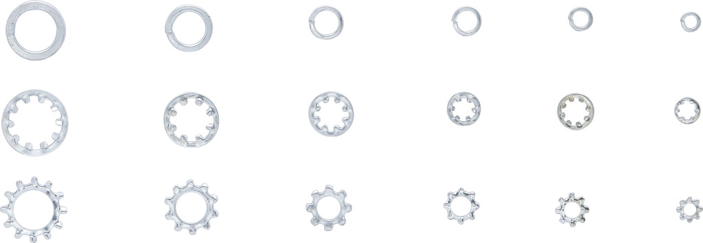 Rugós alátét készlet, 720 db: különböző alakú és méretű rugós, fogazott és biztosító alátétek szortimentdobozban, falikárpithoz alkalmas csomagolás.
