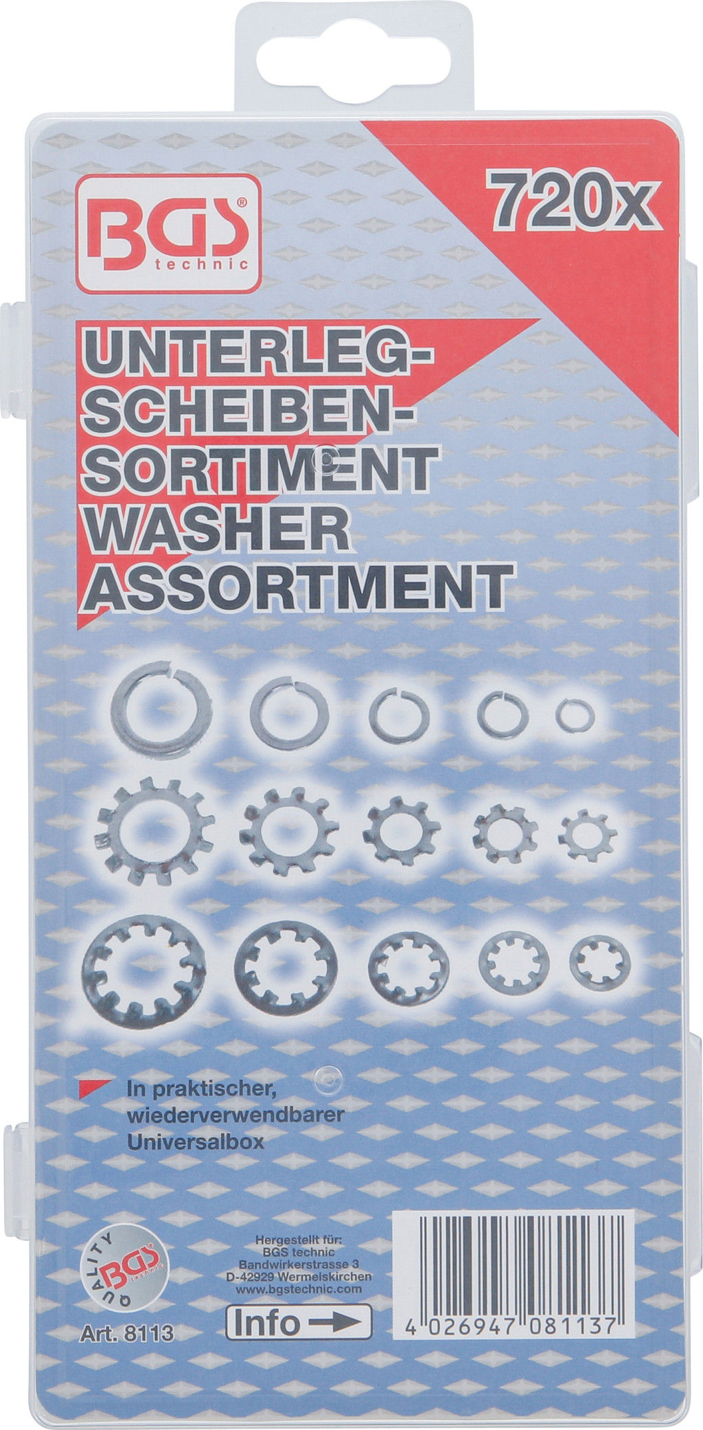 Rugós alátét készlet, 720 darabos szortimentdobozban. A csomag különböző alakú és méretű rugós, fogazott és biztosító alátéteket tartalmaz, rendszerezett rekeszekkel a gyors azonosításhoz és kiválasztáshoz. A csomagolás falra akasztható kialakítású, áttekinthető tárolást tesz lehetővé.