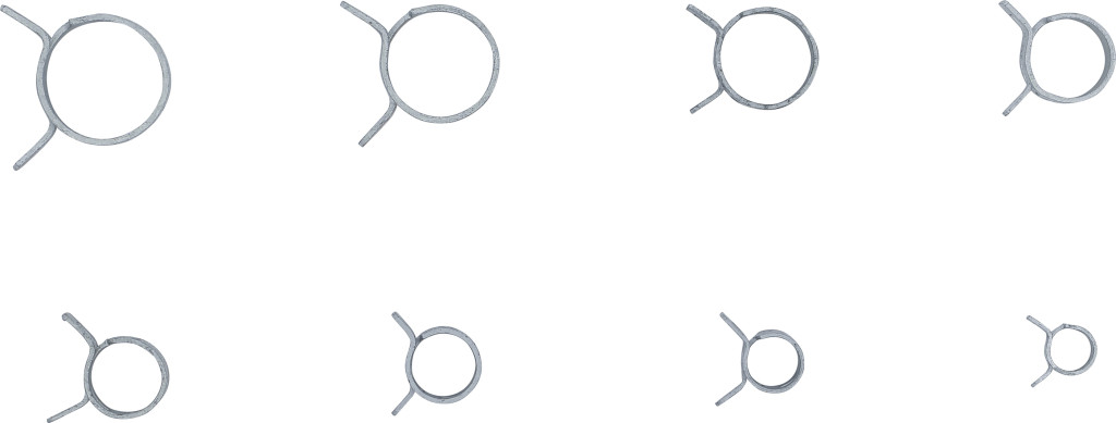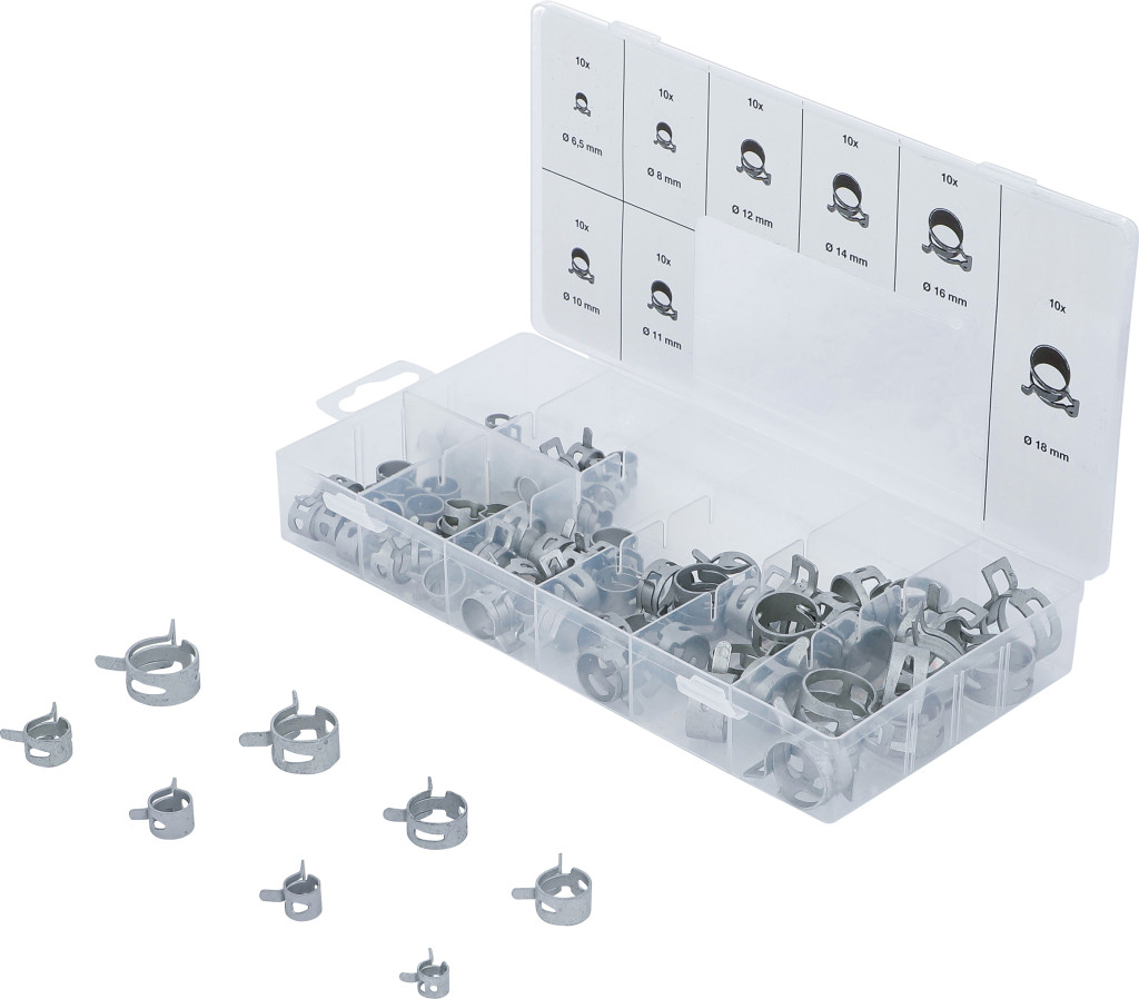 Rugószalagos tömlőbilincs készlet, 80 db (10× Ø 6,5–18 mm). Egyrészes, csavarmentes, önfeszítő, egyenletes szorítóerő, kerek. Alkalmas üzemanyag légtelenítő, hűtő- és fűtővíz áramkörökhöz.