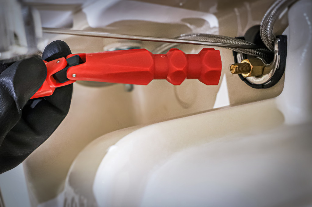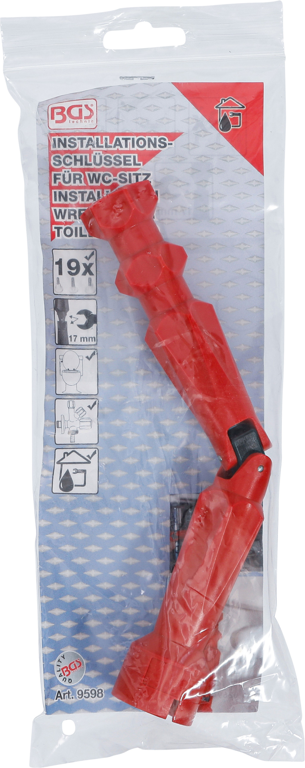 Szerelőkulcs WC ülőke — 200 mm, higiénikus, könnyen használható; 6–10 mm menetes rúdhoz, sarokszelep kinyitásához/elzárásához, speciális csukló optimális emelőhatással.
