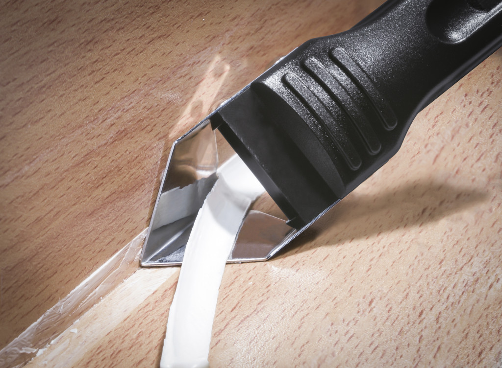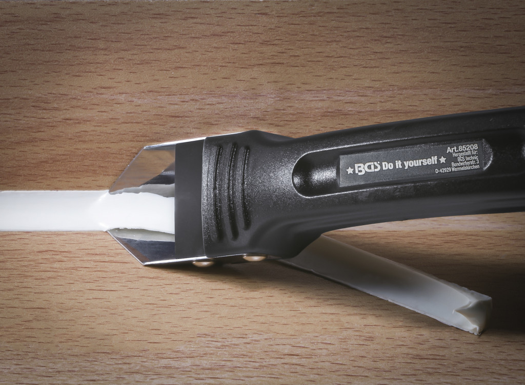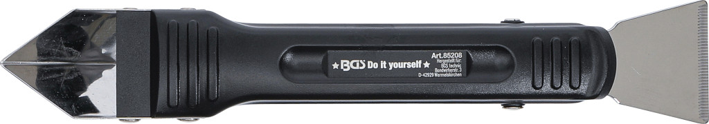 Szilikonfuga-eltávolító rozsdamentes vágóéllel; sima alapra; szilikon és akril fugákhoz; kopásálló műanyag, csúszásgátló markolat; három vágóél toló-, húzó- és kaparómozdulatokhoz.