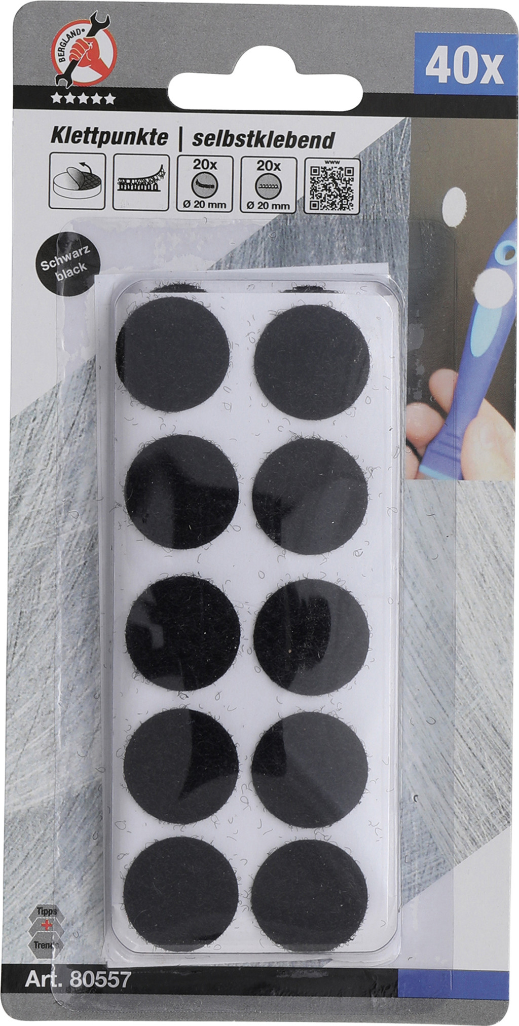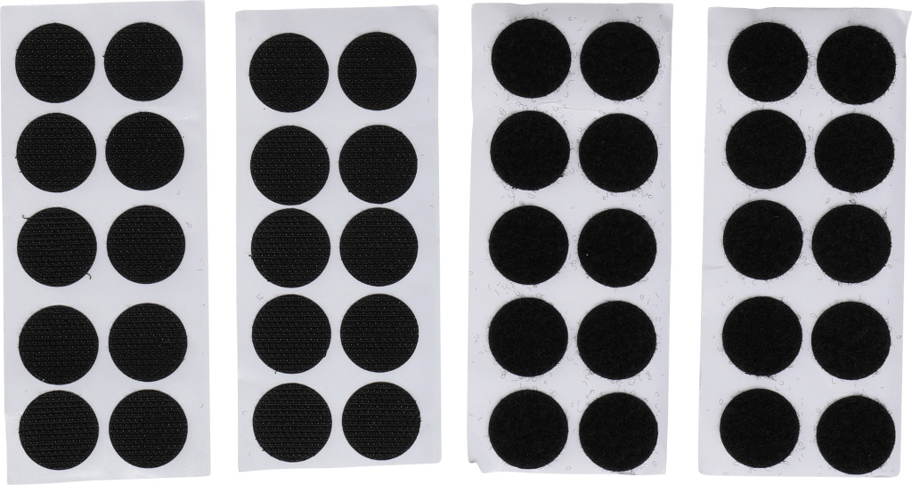 Tépőzáras korongok, öntapadó kivitelben, fekete, 40 darabos csomag. A 20 mm átmérőjű korongok 70% nejlon és 30% poliészter összetételűek, könnyű tárgyak rögzítésére alkalmasak. A csomag 20 beakasztási pontot és 20 tépőzáras rögzítési pontot tartalmaz. Alkalmas falikárpithoz.