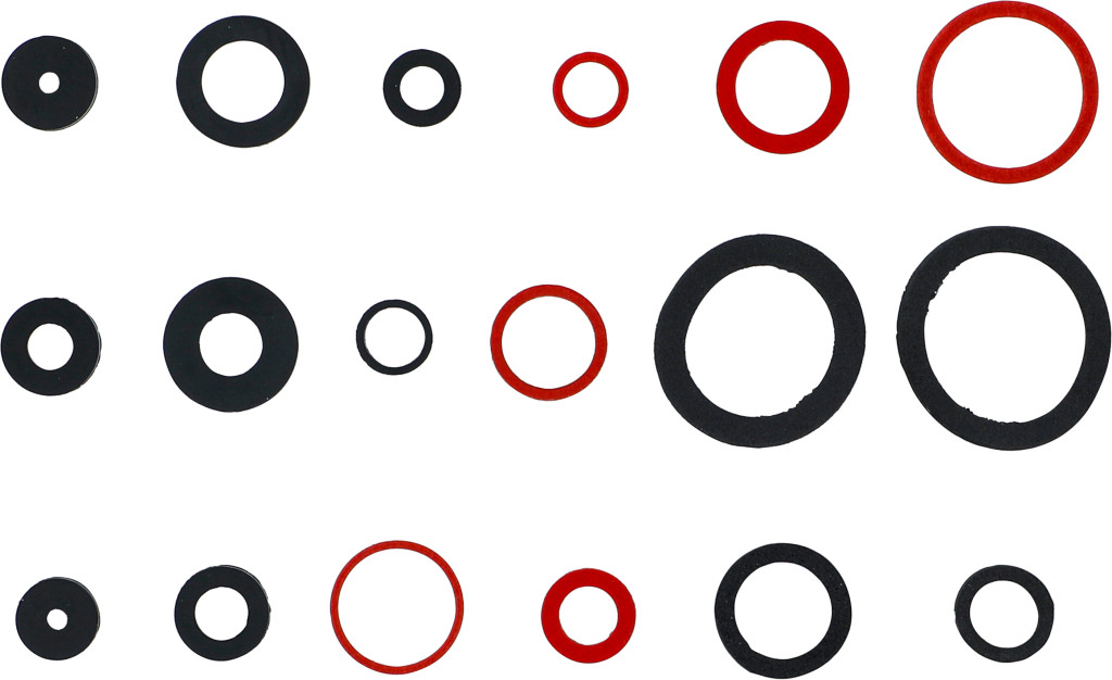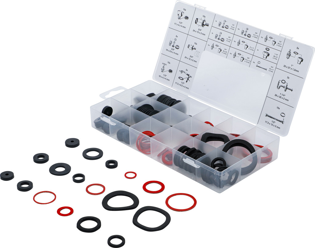 Tömítőgyűrű-készlet, 141 db gumi és üvegszálas tömítések szortimentdobozban; fekete teljes gumi és piros, erősített papírszálas gyűrűk; szaniterterületen alkalmazható. Falikárpithoz alkalmas csomagolás